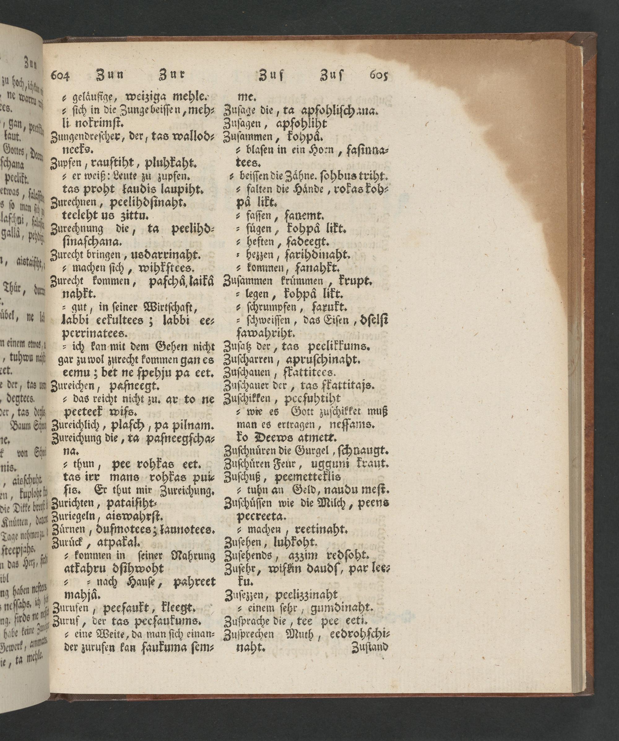 ſsſchuht tas irr mans rohkas pui⸗ 9 3 bür fis. Er thut mir Zureichung. die Dite baßt Zurichten, pataiſiht⸗ Knüͤtten, dar Zuriegeln, aiswahrſt. Tage mhma Zuͤrnen dufmotees; launotees. ſteep chs Zuruͤck. atpakal. b he,f ⸗ kommen in ſeiner Nahrung das Mſ atkahru dſihwoht ibl zu win nach Hauſe, pahreet ng haben mahjaͤ. Zurufen, peefaukt, kleegt. Zuruf, der tas peeſaukums. eine Weite, da man ſich einan⸗ der zurufen kan faukuma ſem⸗