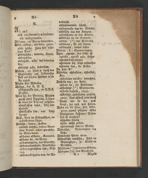 abbi labbi. Zwey ſind beſſer denn Eins! abbejahds, beiderley, foem. abbejahda. abbejadi, adv. auf beiderley⸗ Art.* abbejup adv. beiderſeits. Abbule, ein Bach ſo durch das Smiltentſche und Trikatenſche flieſt und ſich bey Wolmar in die Aa ergieſt. Abuls. ſiehe Ahboles.