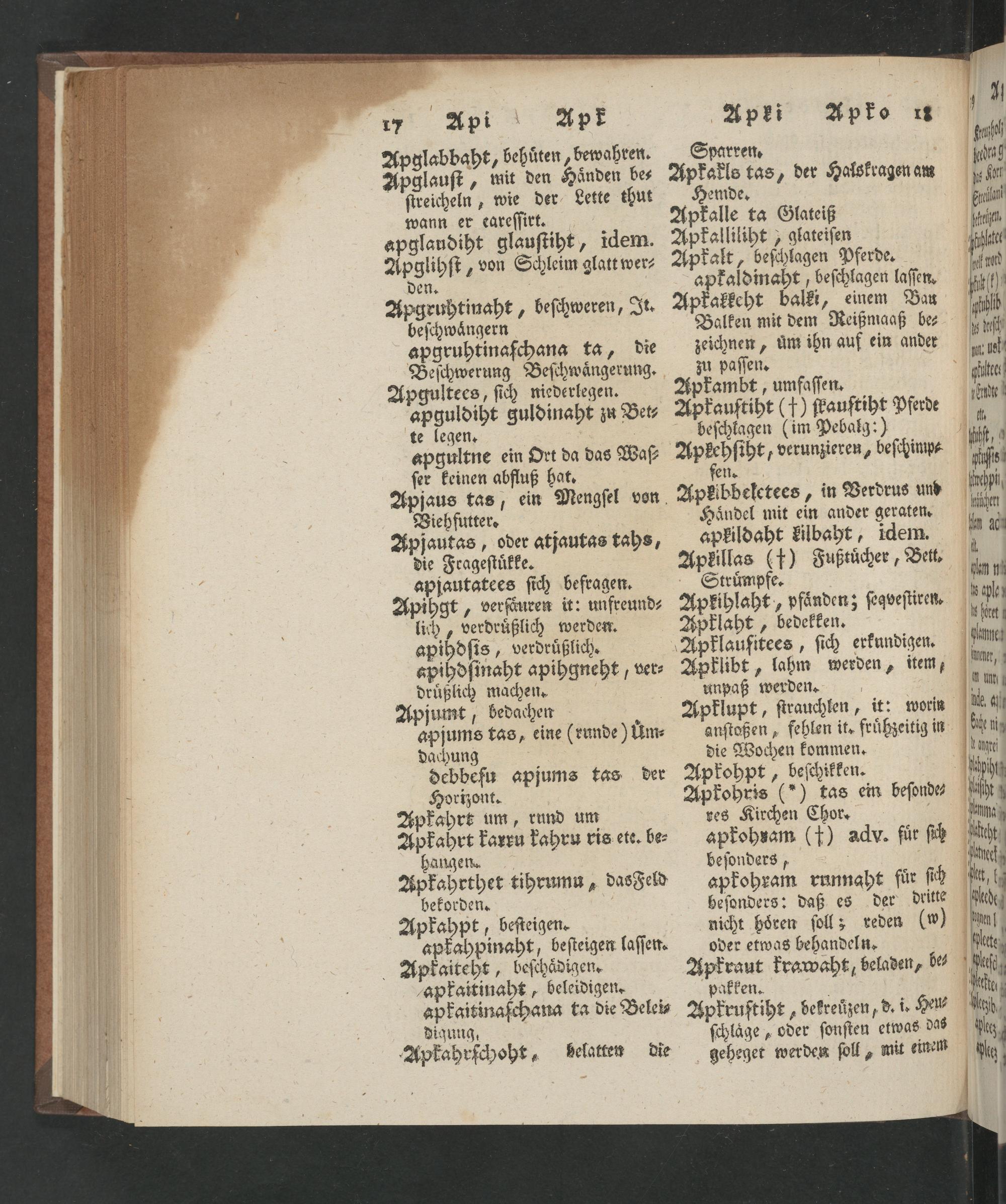 Viehfutter. Haͤndel mit ein ander geraten. Apjautas, oder atjautas tahs, apkildaht kilbaht, idem. die Frageſtuͤkke. Aplillas(†) Fußtuͤcher, Bett. apjautatees ſich befragen. Struͤmpfe. Apihgt, verfaͤuren it: unfreund⸗ Apkihlaht, pfaͤnden; ſegveſtiren. lich, verdruͤßlich werden. Apklaht, bedekken.