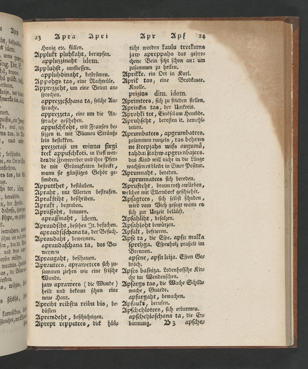 zuſammen runzeln, tas behrns ne ſteepjahs wiſs auguma, tahdai ſtahw apgruenbajees. das Kind will nicht in die Laͤnge wachſen es bleibt in Einer Poſitur. Aprunnaht, bereden.. aprunnatees ſich bereden. Aprufteht, braun roth anfaͤrben, welches mit Ellernbork geſchiehet. Apſagtees, ſich ſelbſt ſchaden, wird vom Vieh geſagt wann es ſich zur Unzeit belaͤuͤft. Apfahliht, beſalzen. Apſahloht bewuͤrzen. Apfalt„befrieren. Apſe ta, die Eſpe. apſu malka ſprehga. Eſpenholz praßelt im Brennen. apſene, apſu leija. Eſpen Ge⸗ roͤch
