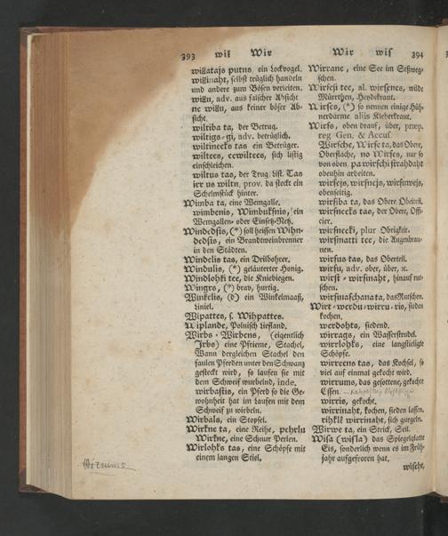dedſis, ein Brandtweinbrenner in den Staͤdten. b Windelis tas, ein Drilbohrer. Windulis,(*) gelaͤuterter Honig. Windlohlki tee, die Kniebiegen. Wingrs,(*) brav, hurtig. Winkelis,(d) ein Winkelmaaß, Leiniel. Wipattes, ſ. Wihpattes. AWiplande, Polniſch iefland. Wirbs⸗Wirbens,(eigentlich Irbs) eine Pfrieme, Stachel, Wann dergleichen Stachel den faulen Pferden unter den Schwanz geſteckt wird, ſo laufen ſie mit dem Schweif wurbelnd, inde. wirbaſtis, ein Pferd ſo die Ge⸗ wohnheit hat im Laufen mit dem Schweif zu wirbeln. Wirbals, ein Stopſel. Wirkne ta, eine Reihe, pehrlu Wirkne, eine Schnur Perlen. Wirlohks tas, eine Schoͤpfe mit einem langen Stiel,