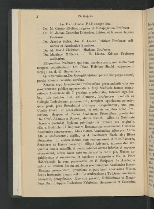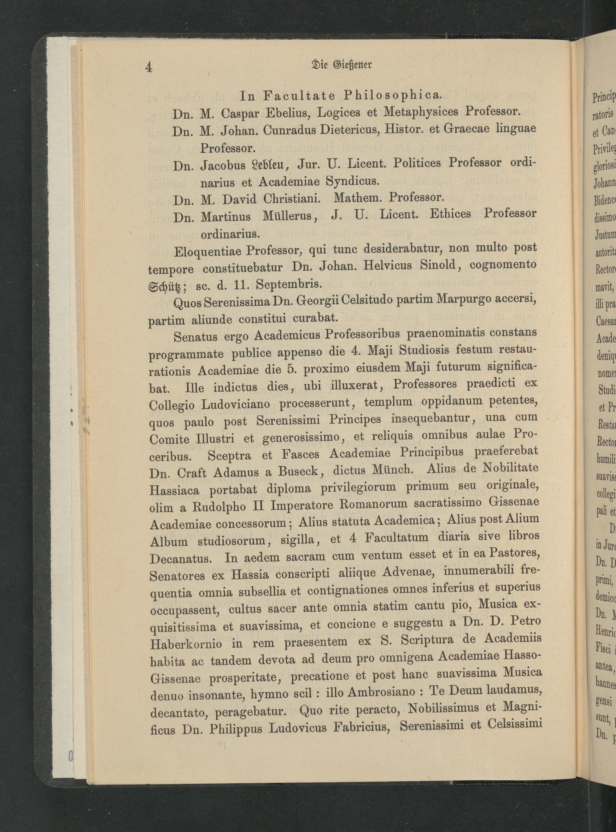 Senatus ergo Academicus Professoribus praenominatis constans programmate publice appenso die 4. Maji Studiosis festum restau- rationis Academiae die 5. proximo eiusdem Maji futurum significa- bat. IIle indictus dies, ubi illuxerat, Professores praedicti ex Collegio Ludoviciano processerunt, templum oppidanum petentes, quos paulo post Serenissimi Principes insequebantur, una cum Comite Illustri et generosissimo, et reliquis omnibus aulae Pro- ceribus. Sceptra et Fasces Academiae Principibus praeferebat Dn. Craft Adamus a Buseck, dictus Münch. Alius de Nobilitate Hassiaca portabat diploma privilegiorum primum seu originale, olim a Rudolpho II Imperatore Romanorum sacratissimo Gissenae Academiae concessorum; Alius statuta Academica; Alius post Alium Album studiosorum, sigilla, et 4 Facultatum diaria sive libros