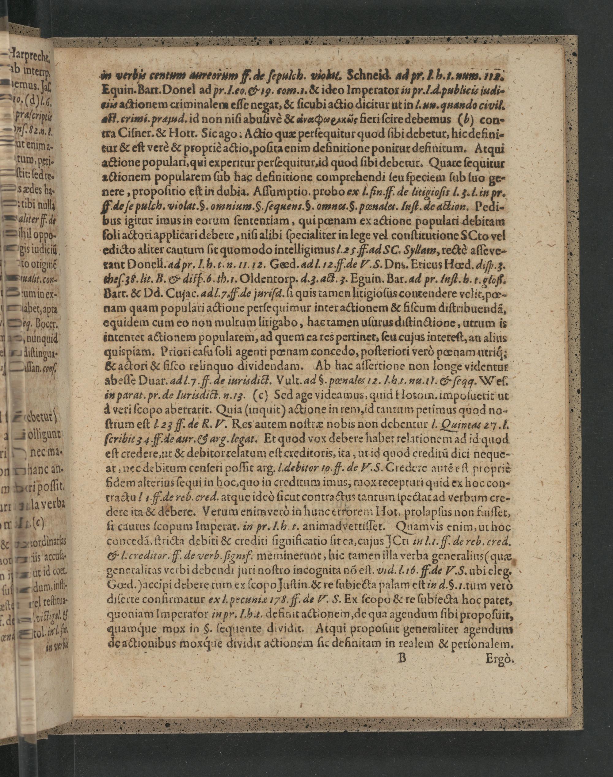 in parat. ꝓr. deæ lurisdict. u. 1½.(c) Sed age videamus, quid Hotom. impoſuerit ut à veri ſcopo aberrarit. Quia(inquit) actione in rem, id tantum petimus quod no- ſtrum eſt 25 ff. de R. V. Res autem noſttæ nobis non debentur 7. Qatnta 2„. f. ſeribit⸗. de aur.& arg. legat. Et quod vox debere habet relationem ad idquod eſt credere, ut& debitorreſatum eſt creditoris, ita, ut id quod creditũ dici neque- at, nec debitum cenſeri poſſit arg. 1.ebitor 10.. de ‧⁄§. Credere autẽ eſt propriè fdem alterius ſequi in hoc, quo in creditum imus, mox recepturi quid ex hoc con- tractu! ⁊.de reb. cred. atque ideò ſicut contractus tanrum ſpectat ad verbum cre- dere ita& debere. Vetum enimverò in hunc errorem Hot. prolapſus non fuiſſet, ſi cautus ſcopum Imperat. in pr. I. h. t. animadvertiſſet. Quamvis enim, ut hoc concedã, ſtricta debiti& crediti ũgnificatio ſit ea, cujus ICti in l.:. ff. de reb. cred. &l. creditor. ſf. de verb. ſigmf. meminerunt, hic tamen illa verba generalins(quæ generalitas verbi debendi juri noſtro incognita nõ eſt. vid. 1.:6. fde V.§. ubi eleg. Gœd.)accipi debere tum ex ſcopo Juſtin.& re ſubiecta palam eſt in d.§.z. tum verò diſerte confirmatur eæx? ꝓecuniæ 174. ff. de U. S. Ex ſcopo& te ſubiecta hoc patet, quoniam Imperator in pr. I. b.t. definit actionein, de qua agendum ſibi propoſuir, quamꝗque mox in§. ſequente dividit. Atqui propoſuit generaliter agendum de actionibus moxq́ue dividit actionem ſic deñnitam in realem& perſonalem. B Ergò.