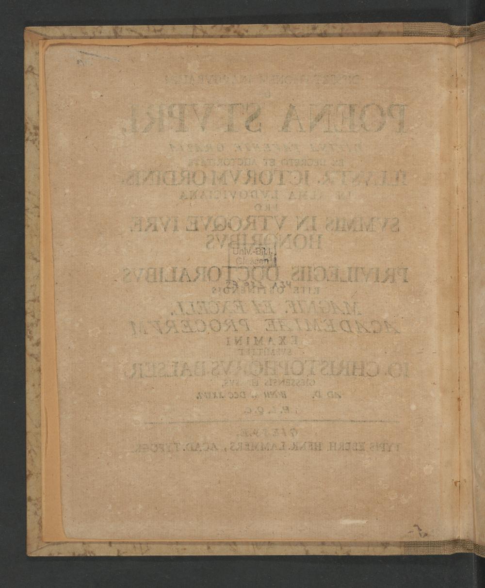 Dissertationem Inavgvralem De Poena Stupri, Divina Facente Gratia Ex Decreto Et Auctoritate Pro Svmmis in Vtroqve Ivre Honoribvs Et Privilegiis Doctoralibvs Rite Obtinendis : Magnif. Et Excell. Academiae Procervm Examini / Svbmittet Io. Christophorvs Balser, Giessensis Hassvs