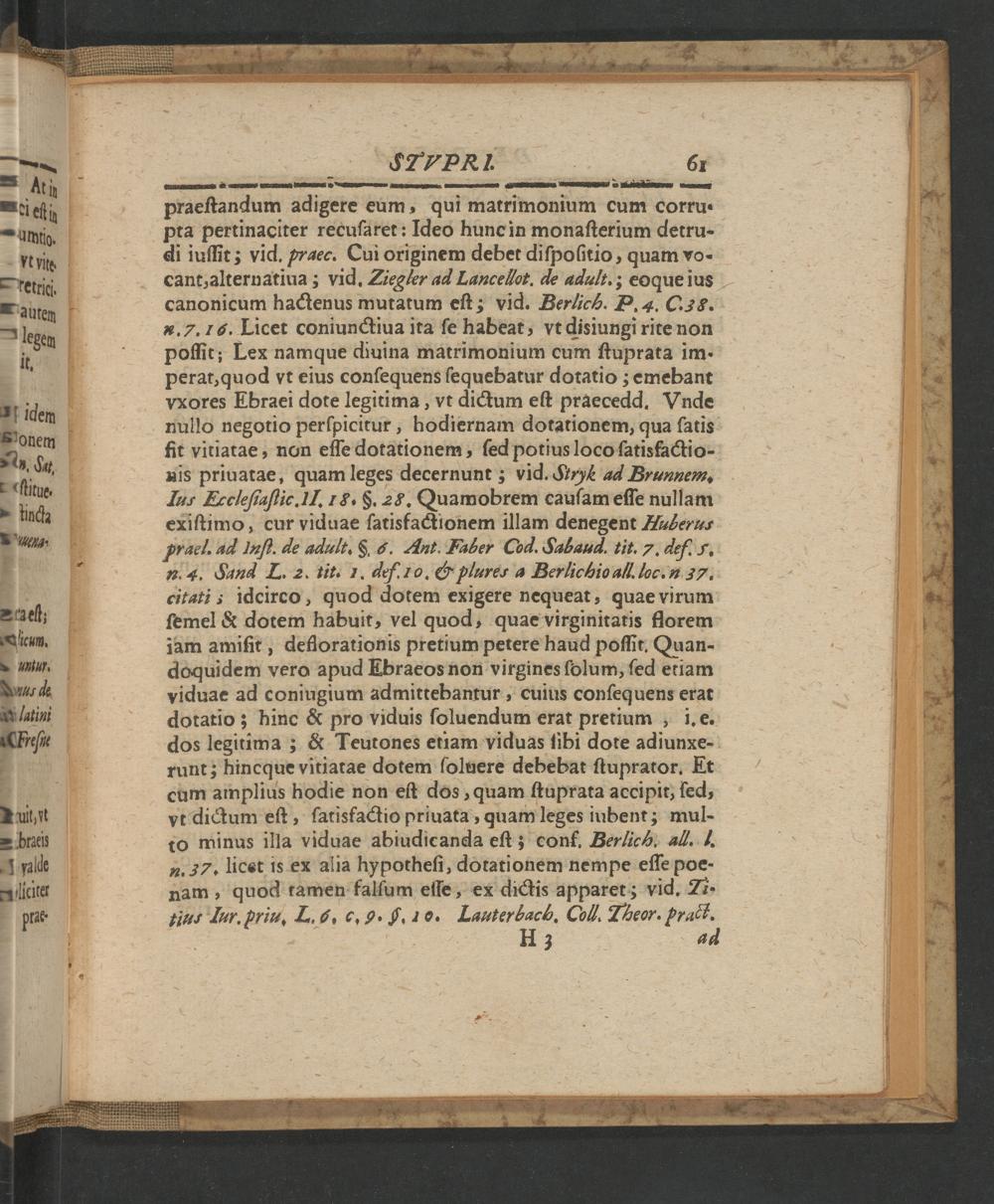 vxOores Ebraei dote legitima, vt dictum eſt praecedd. Vnde nullo negotio perſpicitur, hodiernam dotationem, qua ſatis fit vitiatae, non eſſe dotationem, ſed potius loco ſatisfactio- nis priuatae, quam leges decernunt; vid. Strvyk ad Brunnem. Iu= Eceleſiaflic. I. 15.§. 2ũ. Quamobrem cauſam eſſe nullam exiſtimo, cur viduae ſatisfactionem illam denegent Huberu- prael. ad iuh de adult.§.. Ant. Fuaber Cod. Jabaud. tit. 7. def. y. n. 4. Jand L. 2. tit. 7. def. 10.& plure= a Berlichio all. loc. n 77, citati;, idcirco, quod dotem exigere nequeat, quae virum ſemel& dotem habuit, vel quod, quae virginitatis florem iam amiſit, deflorationis pretium petere haud pofſit. Quan- doquidem vero apud Ebraeos non virgines ſolum, ſed etiam viduae ad coniugium admittebantur, cuius conſequens erat dotatio; hinc& pro viduis ſoluendum erat pretium, i. e. dos legitima;& Teutones etiam viduas ſibi dote adiunxe- runt; hincque vitiatae dotem ſoluere debebat ſtuprator. Et cum amplius hodie non eſt dos, quam ſtuprata accipit, ſed, vt dictum eſt, ſatisfactio priuata, quam leges iubent; mul- to minus illa viduae abiudicanda eſt; conf. Berlacb. all. I. 2. 57. licet is ex alia hypotheſi, dotationem nempe eſſe poe- nam, quod tamen falſum eſſe, ex dictis apparet; vid. Zi- tiu- Lur. priu. L. F, c, 9. S. 1%. Lauterbacb. Cbll. Theor. pradt.