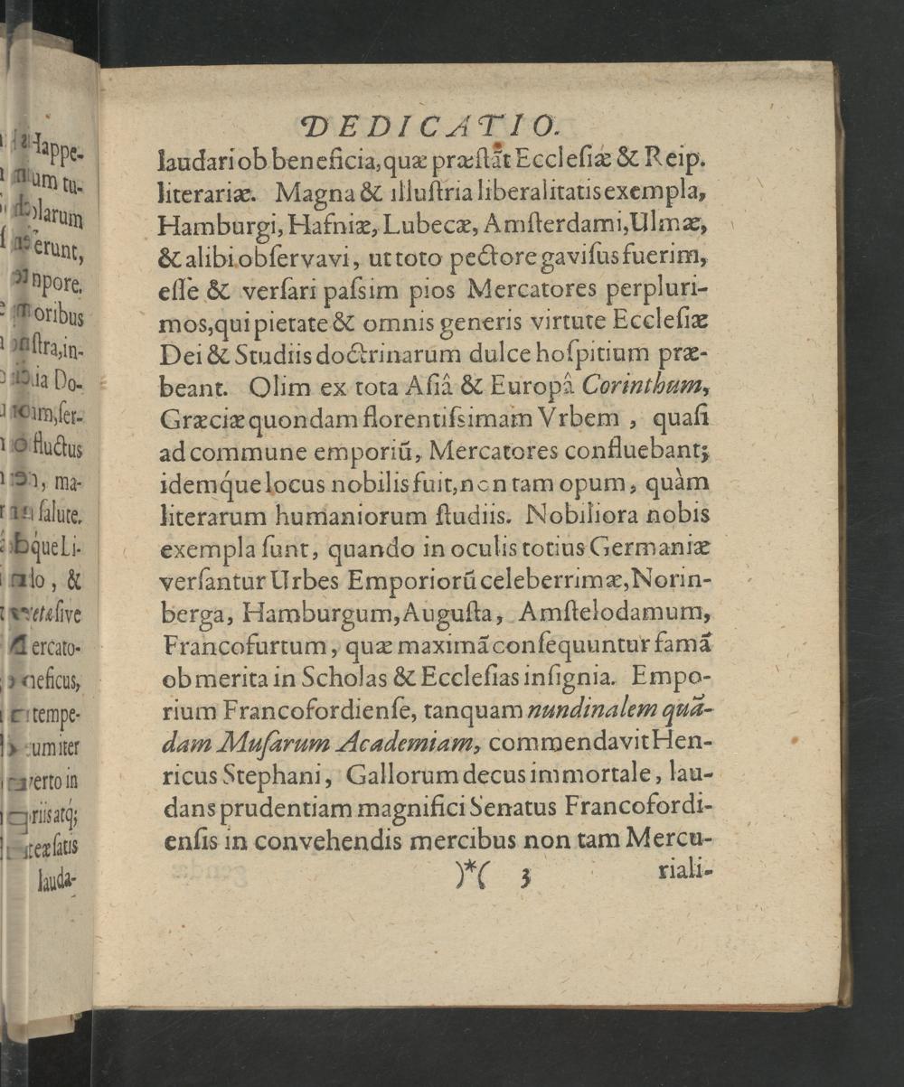 laudariob beneficia, quæ praæſtàt Eœcleſiæ& Reip. literariæ. Magna& illuſtria liberalitatisexempla, Hamburgi, Hafniæ, Lubecæ, Amſterdami, Ulmæ, & alibi obſervavi, ut toto pectore gaviſus fuerim, eſſe& verſari paſs im pios Mercatores perpluri- mos, qui pietate& omnis generis virtute Eccleſiæ Dei& Studiis doctrinarum dulce hoſpitium præ- beant. Olim ex tota Afià& Europa Corinthum, Græciæ quondam florentiſsimam Vrbem, quaſi ad commune emporiũ, Mercatores confluebant; idemque locus nobilis fuit, non tam opum, quàm literarum humaniorum ſtudiis. Nobiliora nobis exempla ſunt, quando in oculis totius Germaniæ verſantur Urbes Emporiorũ celeberrimæ, Norin- berga, Hamburgum, Auguſta, Amſtelodamum, Francofurtum, quæ maximã confequuntur famã ob merita in Scholas& Eccleſias inſignia. Empo- rium Francofordienſe, tanquam nundinalem quã- dam Mufarum Academiam, commendavit Hen- ricus Stephani, Gallorum decus in mortale, lau- dans prudentiam magnifici Senatus Francofordi- enſis in convehendis mercibus non tam Mercu-