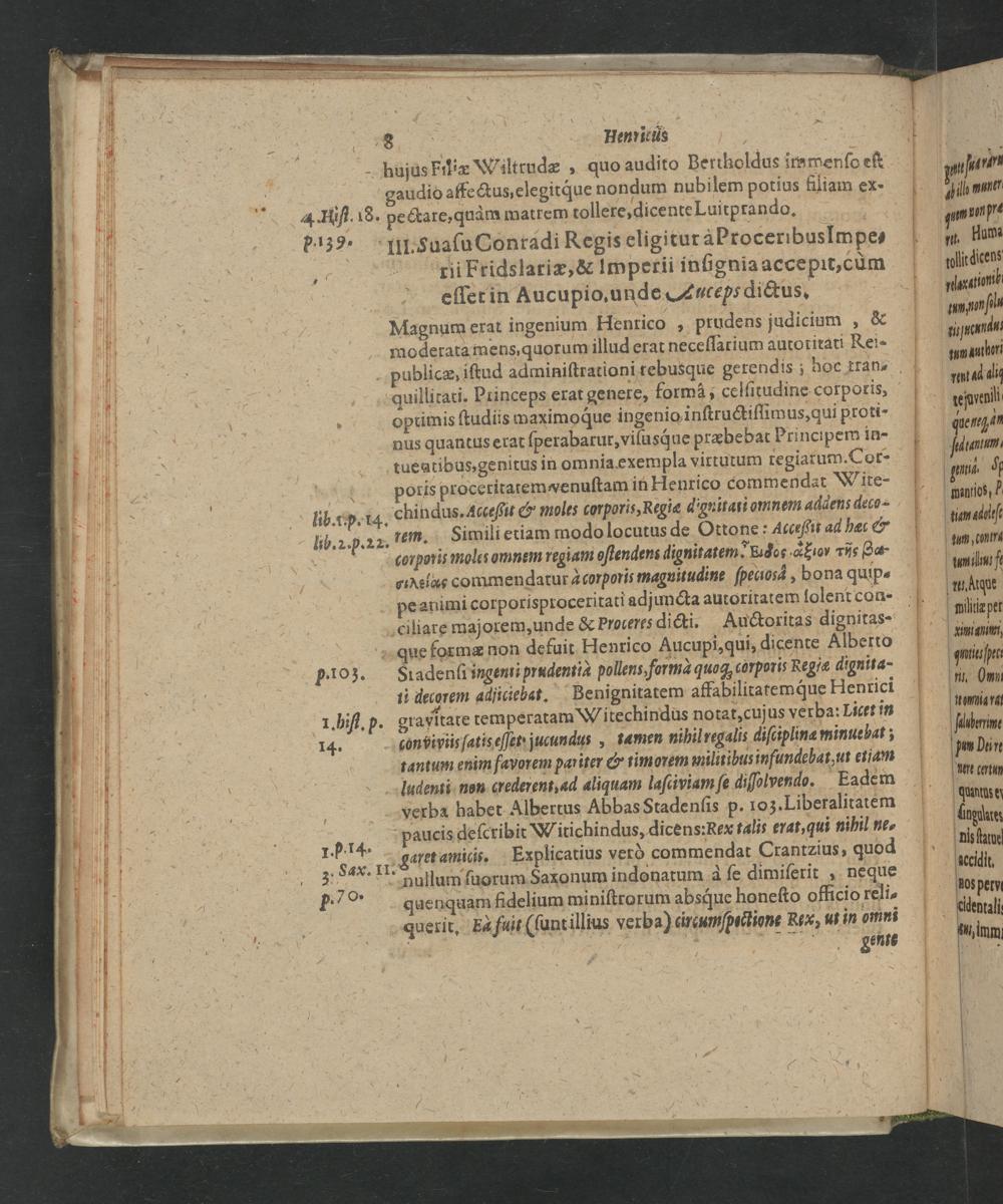 8 I Henrieus 4 hnujus Filiæ Wiltrudæ, quo audito Bertholdus im wenſo eſt uhurnpn gaudio affe ctus, elegitq́ue nondum nubilem potius filiam ex ha maun 3 4.H t. 18. pectare, quàm matrem tollere, dicente Luitprando. Nunpe et33. IlI. Suaſu Conradi Regis eligitur àProceribuslmpe- 8 7 lluma aul bridslariæ,& Imperii inſignia accepit, cùm tolitdicens eſſer in Aucupio. unde Auceps dictus. Aluratimi Magnum erat ingenium Henrico, prudens judicium,& mnuußi moderata mens, quorum illud erat neceſſarium autotitati Rei-x kinuun 9 publicæ, iſtud adminiſtrationi rebusque gerendis; hoc tran-ʒ 1ui quillitati. Princeps erat genere, formà, celſitudine corporis, b Iau dit ſoptimis ſtudiis maximoque ingenio inſtructiſſimus, qui proti- reftrenn nus quantus erat ſperabarur, viſusque præbebat Principem in- Scteaeha tueatibus, genitus in omnia exempla virtutum tegiarum. Cor- haim r poris proceritatem wenuſtam in Henrico commendat Wite- Pn 1 h. rp. t4. chihdus. Acceſſir& moles corporis, Regie dignitati omnem adiens deco- an 1b. 2.p. 22. fem. Simili etiam modo locutus de Ottone: Acceſſit ad het Cq uama di corporis moles omnem regiam oſtendens dignitatem. Eidos dεον τũ aH. ain an - Meias commendarur àorporis magnitudine ſpecioꝛd, bona quip- b uminuf peanimi corporisproceritati adjuncta autoritatem lolent con- urraghe ciliare majorem, unde& Proceres dicti. Auctoritas dignitas- miniepet que formæ non defuit Henrico Aucupi, qui, dicente Aiberto umaum 5. 103. Siadenſi ingensi pradentia pollens, forma quoq torporis Reęgiæ dignita-- Fniiſee i decorem adjiciebat. Benignitatem affabilitatemq́ue Henrici.u Om 1. hiſt. p. grayitate tem peratam Witechindus notat, cujus verba: Licet in BJeehata 14. on biviis ſatis eſſet jucundus, tamen nihilregalis diſciplinæ minuebat; auhrmime tantum enim favorem pariter& timorem militibus infundebat, ut etjan Hdan Dein ludenti non crederent, ad aliquam laſeiviam ſe diſolvendo. Eadem dene catun gerba habet Albertus Abbas Stadenſis p. 103. Liberalitatem ryr4. 3 paucis deſcribit W itichindus, dicens: Rex tali erat, qui nihil ne. TKax. II. Salet amicis. Explicatius verò commendat Crantzius, quoaoacg 7 352 0. nullum ſuorum Sazonum indonatum à ſe dimiſerit, neque 4 5 quenquam fidelium miniſtrorum absque honeſto officio reli- b auerit, Ea fuit(ſunt illius verba]) circumſpoctione Rex, ut in omni uanlalt