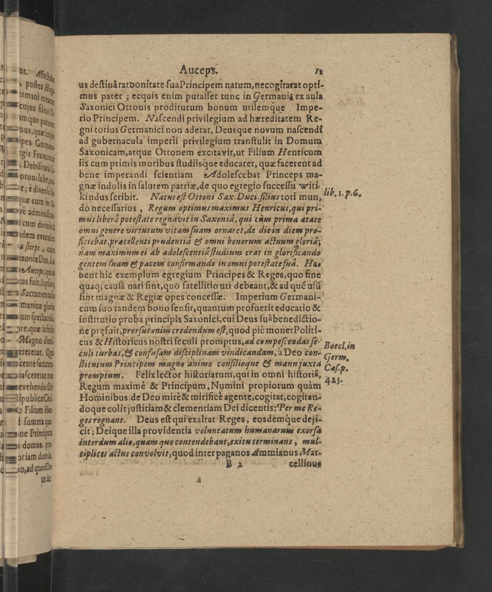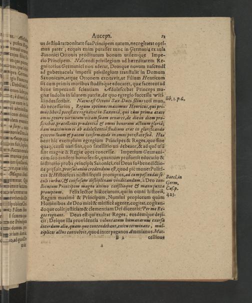 nam maximum ei ab adoleſcentid ſtudium erat in gloriicando gentem ſuam ⁴ pacem conſirmando in omni poteſtate ſud. Ha⸗ bent hic exemplum egregium Principes& Reges, quo fine quaq; cauſà nati ſint, quõ ſatellitio uti debeant,& ad quẽ uſũ ſint magoæ& Regiæ opes conceſſæ. Imperium Germani- cum ſuo tandem bono ſenſit, quantum profuerit educatio& inſtitutio proha principis Saxonici, cui Deus ſuàbenedictio- ne prefuit, prorſus enim credendum eſt, quod piè moner Politi- cus& Hiſtoricus noſtri ſeculi promptus, ad compeſceudas ſe-