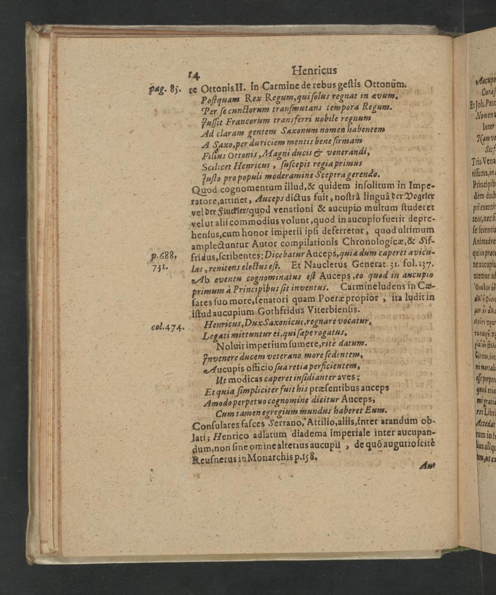 Carmineludens in Cæ- ſares ſuo more, ſenatori quam Poetæ propior„ ita ludit in iſtud aucupium Gothfridus Viterbieniſs. Henricus, Dux Saxonicus, regnare vocatur, 6 8.