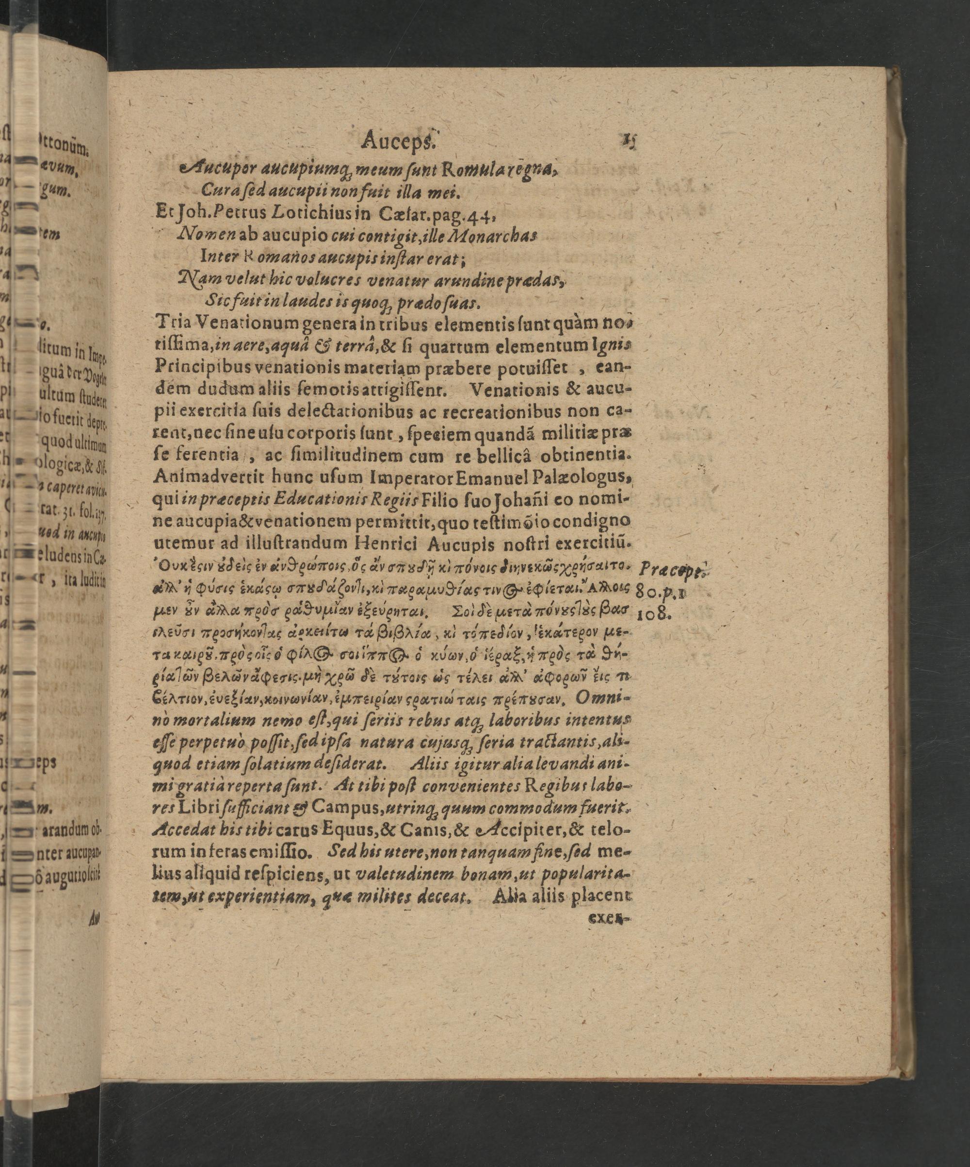 tiſſima, in aere, aquà&s terrã,& ſi quartum elementum Igni⸗ Principibus venationis materiam præbere potuiſſet, ean- dem dudum aliis ſemotis atrigiffenr. Venationis& aucu- pii exercitia ſuis delectationibus ac recreationibus non ca- rent, nec ſine ulu corporis ſunt, ſpesiem quandã militiæ pra ſe ferentia, ac ſimilitudinem cum re bellicà obtinentia. Animadvertit hunc uſum Imperaror Emanuel Palæologus, qui in præceptis Educationir Regiis Filio ſ uo Johañi eo nomi- ne aucupia& venationem permittit, quo teſtimõio condigno utemur ad illuſtrandum Henrici Aucupis noſtri exercitiũ-