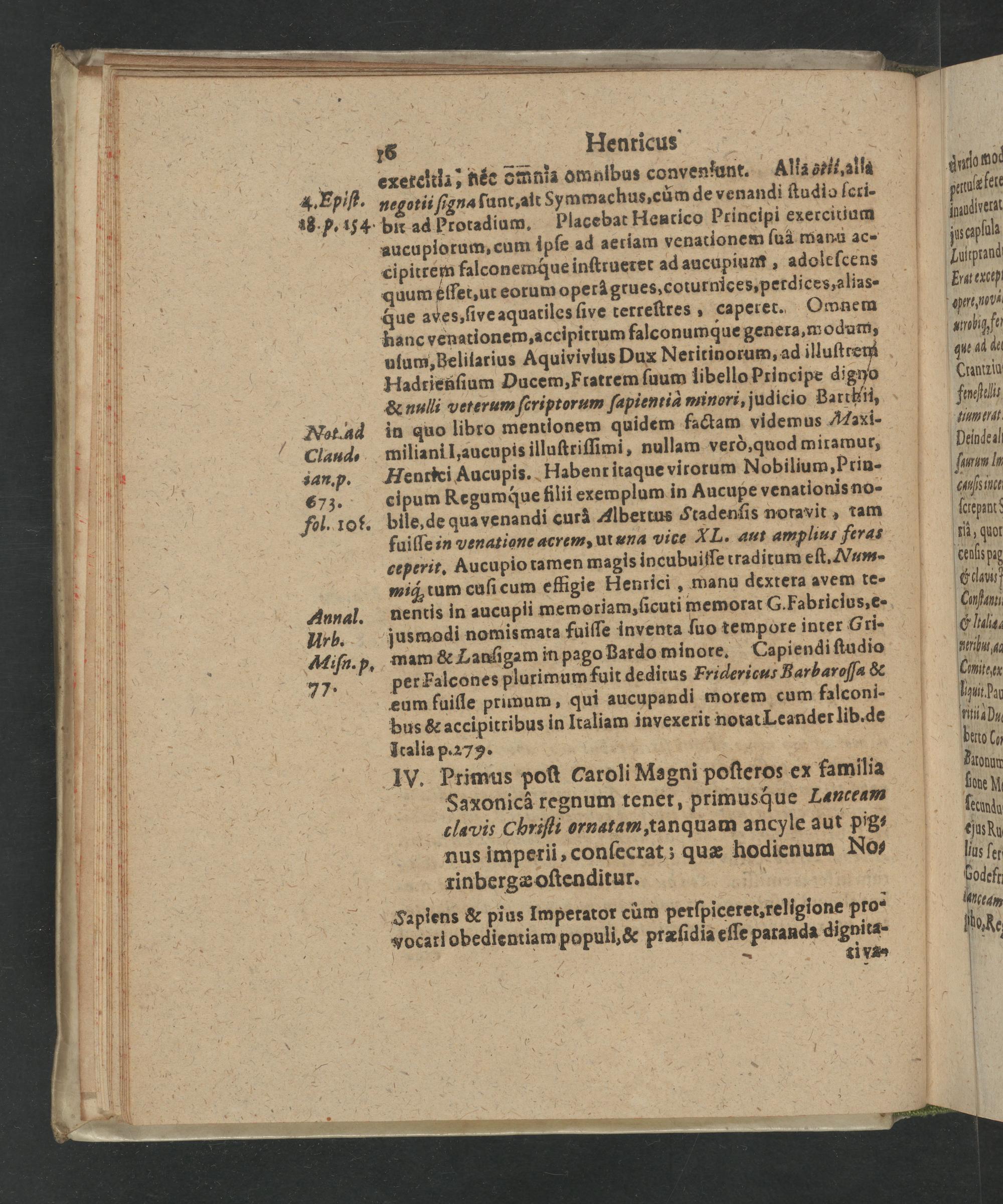 que aves, ſive aquatiles ſive terreſtres, caperet. Omnem hanc venationem, accipitrum falconumque genera, m odum, ulum, Belilarius Aquivivius Dux Neritinorum, ad illuſtrem iadrienſium Ducem, Fratrem ſuum libello Principe digyo & nulli veterum ſcriptorum ſapientià minori, judicio Bartkii, in quo libro mentionem quidem factam videmus Maxi- miliani l, aucupis illuſtriſſimi, nullam verò, qunod mitamut, Heurici Aucupis. Habenr itaque virorum Nobilium, Prin- cipum Regumque fllii exemplum in Aucupe venationis no- bile, de qua venandi curà Albertus Stadenſis noravit, tam fuiſſe in venatione acrem, ut na vice AL. aut amplius feras ceperit. Aucupio tamen magis incubuiſſe traditum eſt. Num- miq, tum cuſi cum effigie Henrici, manu dextera avem te- nentis in aucupii memoriam, ſicuti memorat G. Fabricius, e- jusmodi nomismata fuiſſe inventa ſuo tempore inter Gri- mam& Lanſigam in pago Bardo minore. Capiendi ſtudio per Falcones plurimum fuit deditus Fridericus Rarbaroſſa& eum fuiſle primum, qui aucupandi morem cum falconi- bus& accipitribus in Italiam invexerit notat Leandet lib. de Icalia p. 279. IV. Primus poſt Caroli Msgni poſteros ex familia Saxonicad regnum tenet, primusque Lanceam clavis Chrifti ornatam, tanquam ancyle aut pig⸗ nus imperi, conſecrat; quæ hodienum No⸗