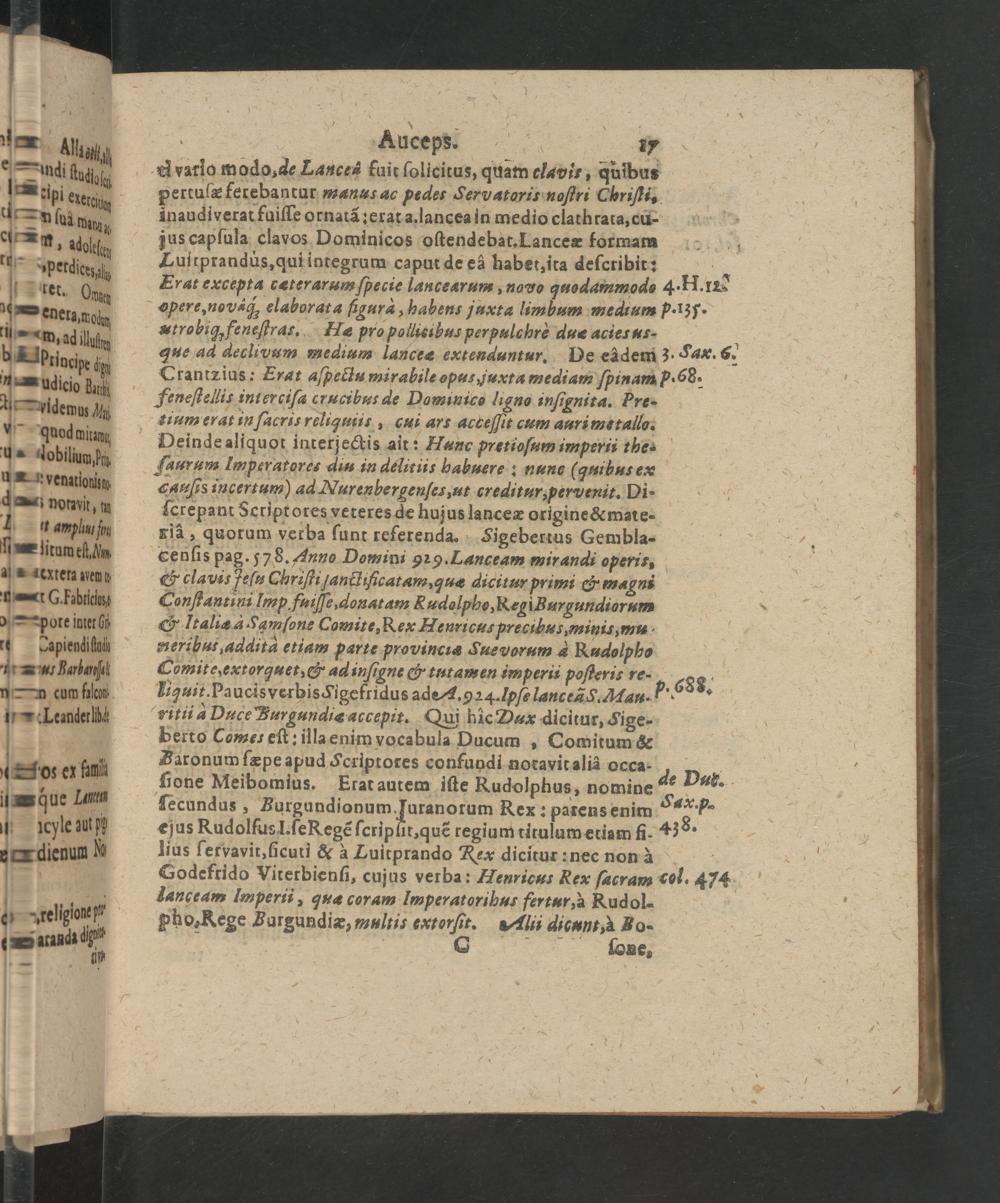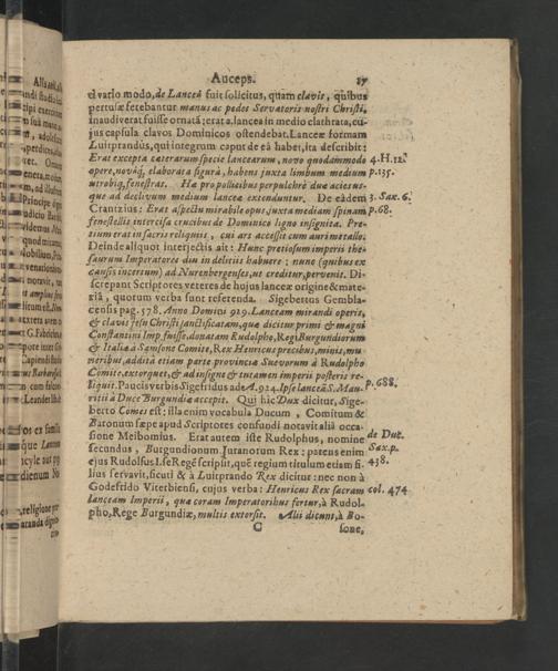 pertuſæ ferebantur manus ac pedes Servataris noſtri Cbriſti, inaudiverat fuiſſe ornatã: erat a. lancea in medio clathrata, cu- jus capſula clavos Dominicos oſtendebat. Lanceæ formaoem Luitprandus, qui integrum caput de e habet, ita deſcribit:. Erat excepta cæterarum ſpecie lancearum, novo quodammodo 4·H. 128 opere, novãg, elaborata figura, habens juxta limbum medeum p. 135. ætrobig, feneſtrar. Haæ pro pollisibus perpulehrè duæ acies us-. que ad declivum medium lanceæ extenduntur. De edem 3. Sax. 6. Crantzius: Erat aſpetlu mirabile opus juxta mediam ſpinam p. 68.