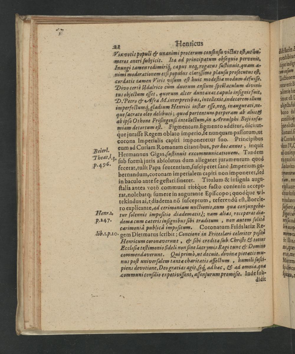 que juraſſe Regem oblato imperio, ſe nunquam paſſatumuĩ ö corona Imperialis capiti imponeretur ſuo. Principibus Beierl. Lum ad Curiam Romanam citantibus, per Hos annos„inquit Theat.1. Hermannus Gigas: ſaſtinait excommunicatecuenn. Tandem p. 496. ſub formà juris ablolutus dum allegaret juramentum quod fecerat, tulit Papa ſententiam, ſuſciperet ſanè Imperium gu- bernandum, coronam imperialem capiti non imponetet, ſed