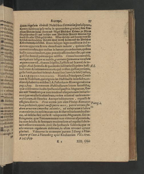 geſta fuerit, curiosè inſeruit Annalibus Suevicis ſuis Cruſius, 2. 4. c.l. p. 99.100.101.102.103. Nomina Principum, Comi- tum& Nobilium, qui triginta ſex Haſtiludiis interfuère, or- dine alphaberico exhiber J. A. Paſtorius in Henuinge redivive pag.3. ſeqgq. Inveterum Haſtiludiorum locum fucceſsère, quæ celebrantur hodie Spectacula Equeſtria Magnatum, Tor⸗ nier und Ritterſpiel/ quæ non modò ad uſurpationem imitatio- nemque vetuſtatis adumbrata, verm etiam ad umbram ex- ercitiorum, ab Henrico Aucupe inſtitutorum, expreſſa& effigiata dixeris. ſuos perſtrinxit, quod omiſſo patrio more, patria virtute ſtu- dium armorum aàmanibus ad oculos, ad voluptatem à labore transtulerint, ita neſcimus an non& iſtæ velitationes hodier- næ, ad delitias ferè verſæ& voluptatem Magnatum, ſint re- ſtringendæ; quæ Torneamentaut non videntur aſpernenda, ĩta cum delectu& ſumtuum moderarione ad regulas ſobrie- ratis eſſent revocanda; imò illa ſpectacula ſolennia, quæ ex uſu veterum regularum deſierunt, in uſum revocari optant plurimi. Videantur in utramque partem J. Georg à Pöni- ckau& Cunr. A Plettenberg apud Kirchnerum Z7l.l. Orat. 347 67g. nais K 2 XIII. Obit