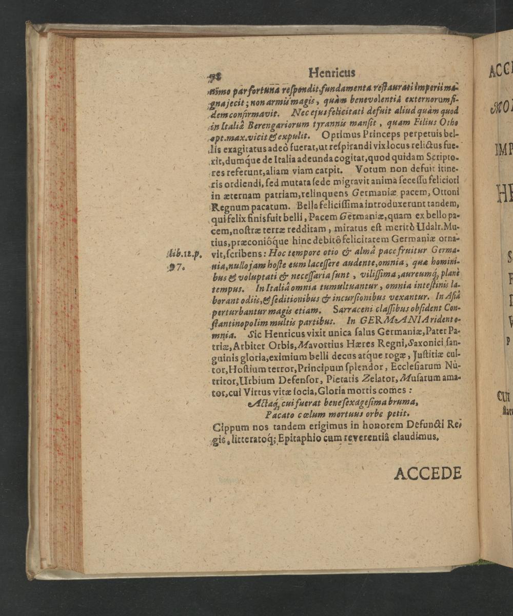 vit, ſcribens: Hoc tempore otio& almâà pace fruitur Germa- uia, nullo jam hoſte eum laceſſere audente, omnia, quæ homini- bus& voluptati& neceſſaria ſunt, viliſima aureumq, planè tempus. In Italid omnia tumultuantur; omnia inte ſtinis la. borant odiis,& ſeditionibus& incurſionibus vexantur, In Ahd perturbantur magis etiam. Sarracéni claſſibus obfident Con- In GERMeANIArident o- mnia. gie Henricus vixit unica ſalus Germaniæ, Pater Pa- triæ, Arbiter Orbis, Mavottius Hæres Regni, Saxonici ſan- guinis gloria, eximium belli decus atque rogæ, Juſtitiæ cul- tor, Hoſtium terror, Principum ſplendor, Eccleſiarum Nuͤ- tritor, UIrbium Defenſor, Pietatis Zelator, Nuſarum ama-