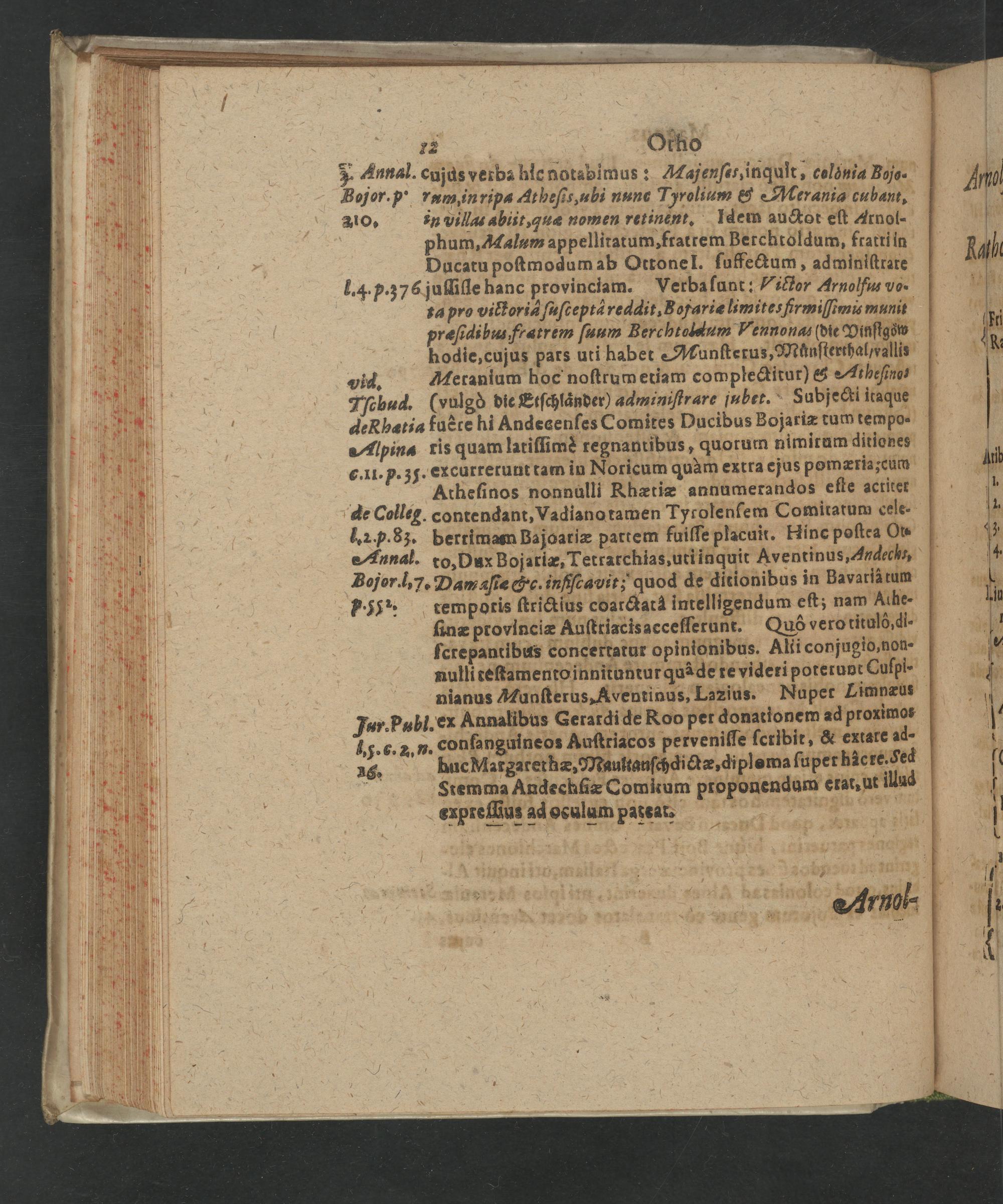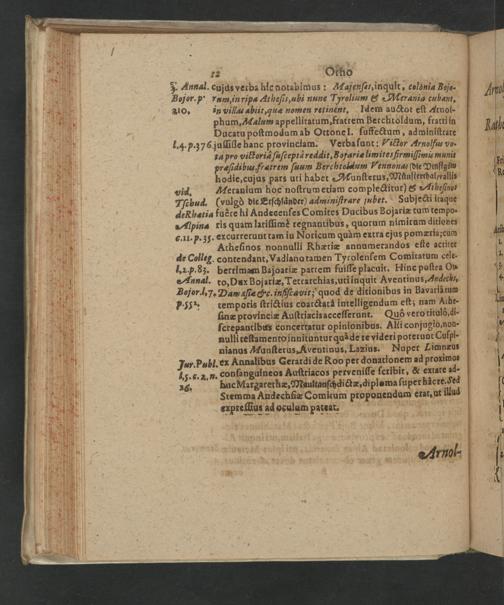 b 1.z. Oho 5. Annal. cujus verba hie notabimus: Majenſas, inqult, colqnia Bojo- Bojor. ꝓ rum in ripa At heſis, ubi nunc Tyrolium& Merania cubant, 310. in villas abiit, quæ nomen retinent. Idein auctot eſt Arnol-