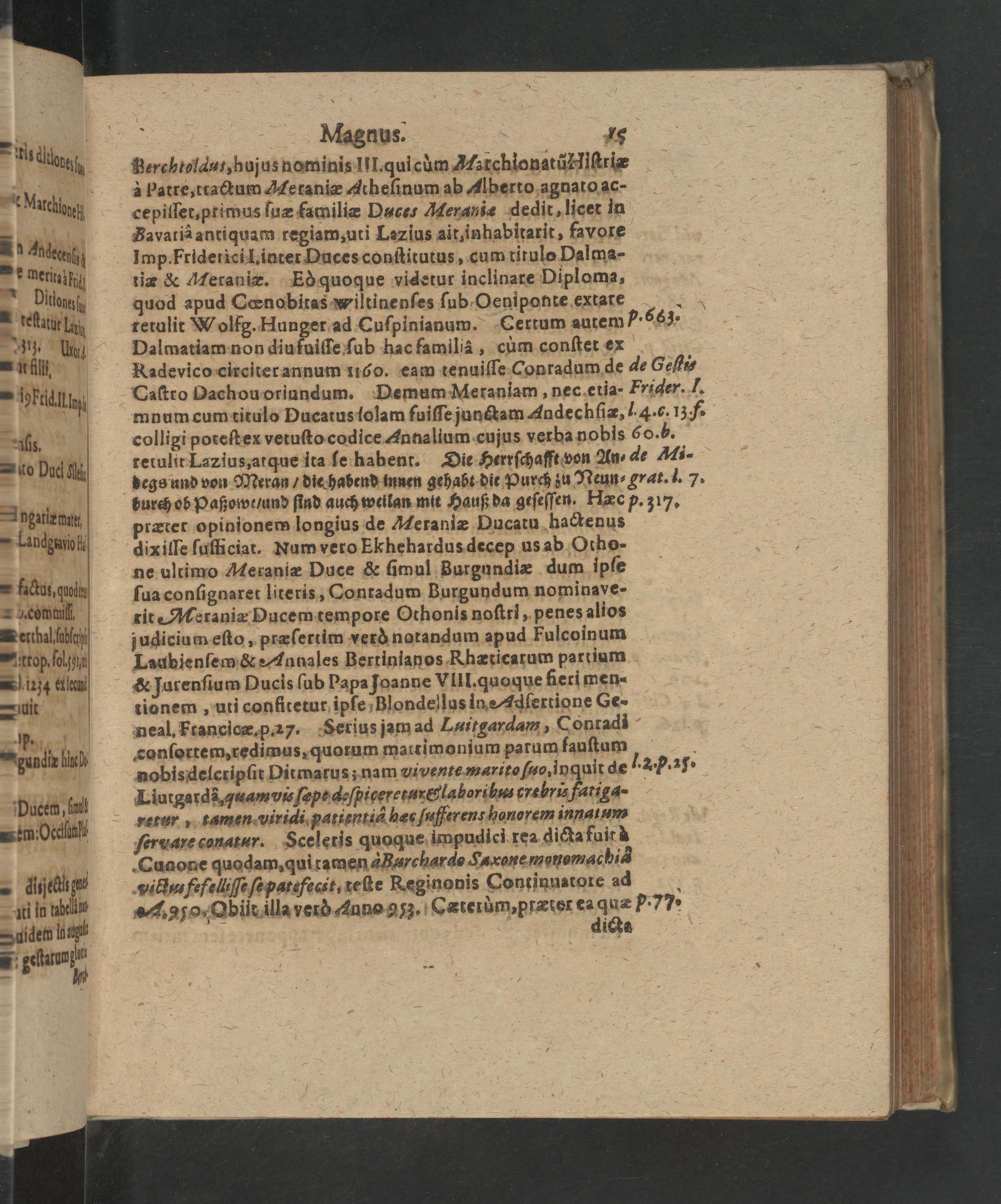 Magnus. b I5 Berchtolaus, hujus nominis III. quicùm Marchionatũkiiſtriæ à patre, tractum Meraniæ Atheſinum ab Alberto agnato ac- cepiſſet, primus ſuæ familiæ Duces Meraniæ dedit, licet in Bavatid antiquam regiam, uti Lazius ait, inhabitarit, favore