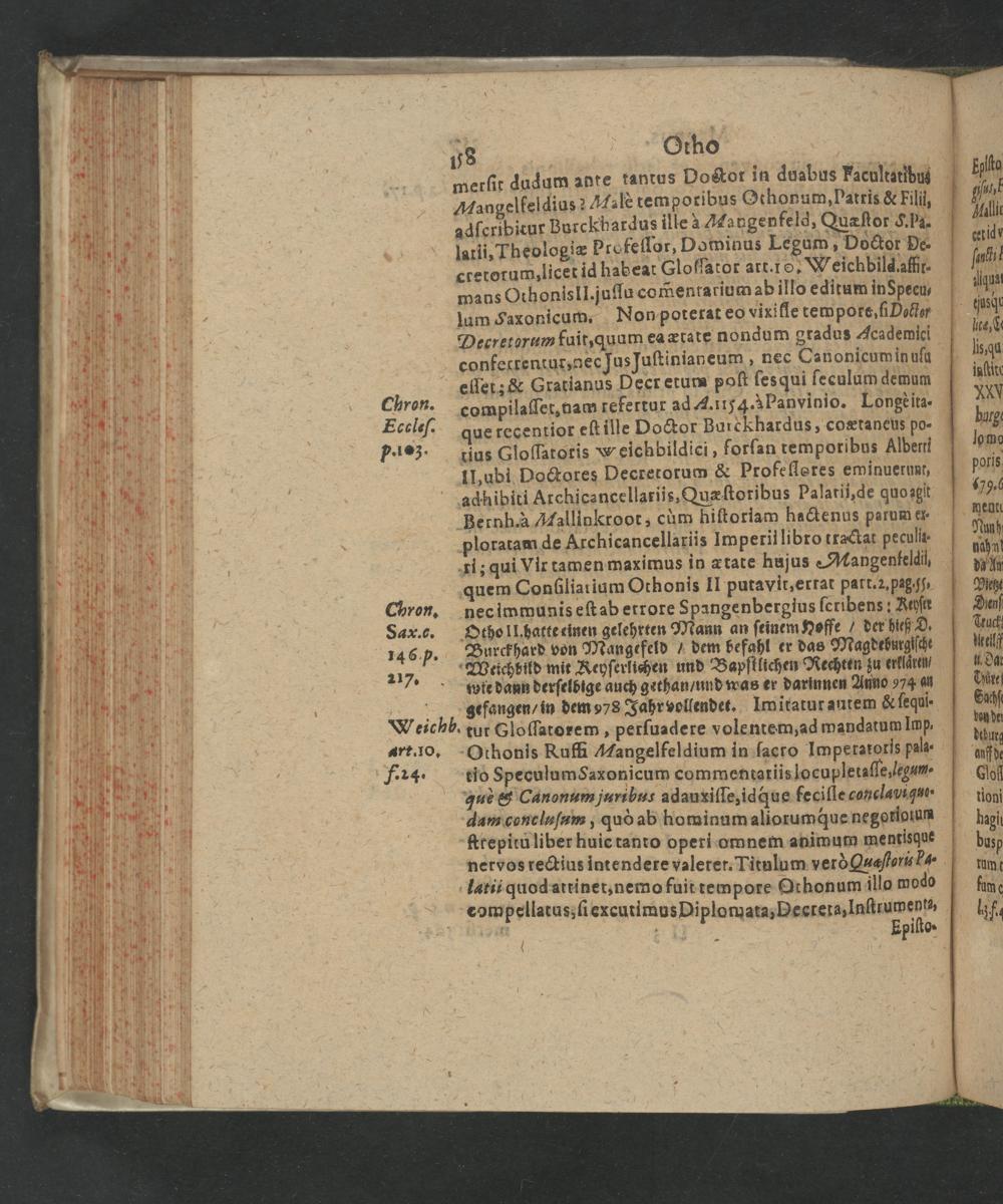 jum a0te tantus Doctor in duabus Facultatibus merſit dudum ze. letemporibus Qthonum, Datris& Filii 8 p 8 adſcribitur Burc brofeſlor, Dominus Legum, Dodtor De⸗ larli.Thfoloic atca:(lofalot art. 10. Weichbild affir⸗ cretorumslicer ia Hlu comentarium ab illo editum in pecu- mans Othonis! Ju Non poterat eo vixifſe tempots, ſi Dolta lum Saxonicum. eletae nondam gradus Academici Decretorum fuit, quum ea ætate nec Canonicum in uſu * 5. aec Jus Juſtinianeum;.— confetrentur, ne lt poſt ſes qui ſeculum demum eſſet;& Gratianus Decr etum poft les qui ſeculum demi eſſet;& Gr fertur ad A. 1154.3 Panvinio. Longeita- Chron. compilaſſet, nam refertur ad. 3 hardus, coxtaneus po- Eccleſ. entior eſt ille Doctor Bure bus Albent * 4 ce⁸ε. que rec. G 2.. f rſan temporl us 3. tius Gloſfatoris«w eichbildici, forſant P. 1e3. ius Glolſat Decrerorum& Profelleres ewinuerunt, V Il,abi Dacres cellariis Quæſtoribus Palarii, de quo agit . ibiti Archicancellariis, Qu: arum ex- adhibiti Archi 4 iſtoriam hactenus parum er . t, cùum hi Or. —“ Atchicane 4 3. D ploratam de Ar hicance darii 1ral. hujus Mangenkeldi ri; qui Vir tamen Othonis II putavit, errat part. z, peg,ſj, quem Conſliarium Otho bergius ſcribens: Kehſer necimmunis eſtab etrore Spangenberg der hieß D. Chron. nec immur lehrten Mann an ſeinem Hoffe/ der hieß Sax. c. Othol atke inen ge Ifed dem befahl er das Dyto deßanſa Burckhard von Mangefeld der en zu etklaten Weichbild mi ndwas er darinnen Anno 974 4 217. wie dann derſelbige auch gethan/ un. m& ſequi⸗ wie dann derſelbig 2 lendet. Imitatur autem& ſeq efangen/ in dem 978 Jahr vollendet. I datum Imp. D. u 9 CAo ſorasemn, perſuadere volentem, ad wanda. d) Feichb. tur 3 oris pala- Othonis Ruffi Mangelfeldium in ſacro Inpfran bef V are. Io. Othon lum Saxonicum commentariis locupletaſſe, egum. 1 b F-4. dos hen enuam umha adauxiſſe, idque feciſſe canclavi quo- 69. ue Cano 1,.„„ 4 4 3 P,e neluſum, quò ab hominum aliorumque ne— b Kt itu liber huie tanto operi omnem animum meumee kep s ge valeret. Titulum verò Quaſioris a- nervos rectius intendere valeret. Snbonuallo odo 1 6 14 Iatii quod attinet, nemo Ainem pote Aahon Inſtrumenta, v As Le 34. compellatus, ſiexcutimus Diplomata, Epiſto 8