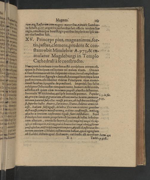 Nunquam hominum vota tàmarctè conſpirare certum eſt, quàm in Principum vel bonam vel walam vitam. Omnes e. ſuas fortunas ut ab his ſuſpenſas vident, ita vel amplectun- turvelexecrãtur. Egregia v. laus eſt,&nnunquã interitura fama poſt mortem, ubi liberior videtur Principum vitas exami- nandi facultas, à populo de prædicari. Imperiali ſuo ſolio refulgens Otho noſter nunquam tanto honore, mihi grede, adfectus eſt quàm cùm mortuus populi planctu defleretur.