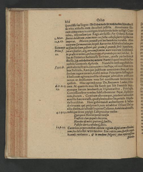 ſpondiſſe ſaa lingua: Bi Othen barde he moth barden ſchmecken /g ſic viro adducto eum decollari juſſiſſe. Severitatem illo- rum iemporum in corrigend dadulterio inde colligit Cran- tzius, reſponſumque Regis ait fuiſſe: Per Othonis Barbam 3. Metr. ſentiet dolabrum ʒ nam inter vos falla colluſioſacris legibus non 12.5. 67. imperat. Morem jurandi per barbamhinc notabis. More veterum germanoruminquit Antonius Albitzius Italus, pro- Stemmat miſſam Harham geſta vit, per quam, ſi quando ſeriò loquebatur, Princ f. jurars ſolebat; atq;, auream ſecurim more veterumn Conſulum ſi 10. bi præferri voluit, quâ nocentes aliquando percuti jubebat, A- lias de Friderico Barbaroſſa ſcribunt, Juraſſe per batbam,& dixiſſe, Ich wils halten bey meinem Barth/id quod retulit in Pro· verbiis Germanis Agricola. Notabilis verò auguſtalis Im- fz 97:5. periiadminiſtratio, nunquam er im Pape vel conblium in re. bus Doliticis, Remque publicam concernentibus, vel con. ſenſum rogare curavit, multò minus Principum ſuffragianiſ. ſi bellorum agitans conſilia rebus que admodunmn arctis, non tamen ut deciſionum vota ſed conſiliotum ſententias ers uiſivit. Hinc optimè notat Dn. Senjamin Leuber, Otho- d. tr. n. 13. nem 4. quamvis mos llle fuerit jam ſub Francicis Impp 69. moxque iterum invaluerit, ut Diplomatibus, Privilegiis, Conceſſionibus nomina ſubſcriberentur Papæ, Epiſcopo- rum, Ducum, Comitum aliorumque, prudenti admodum aonſilio hæc mutaſſe, quod plenitudine Imperialis Majeſta- tis ſe utiſcirer. Hanc gubernandi auctoritatem& bellan- di virtutem qui perſpexerit, non mirabitur Othoni Dei au- xilio dietim, uti alicubi loquitur Cuſanus, dominia advenllle, 4.7,p. 132 tectèq́ue de eo pepigit Luitprandus verſus: Quicquid Henrici periit receſu Praæſtitit claro populis hic ortu, Blandus& mitis, patiensq́, ſanctis, Peſtifer duris, rabiduś; ſevi.
