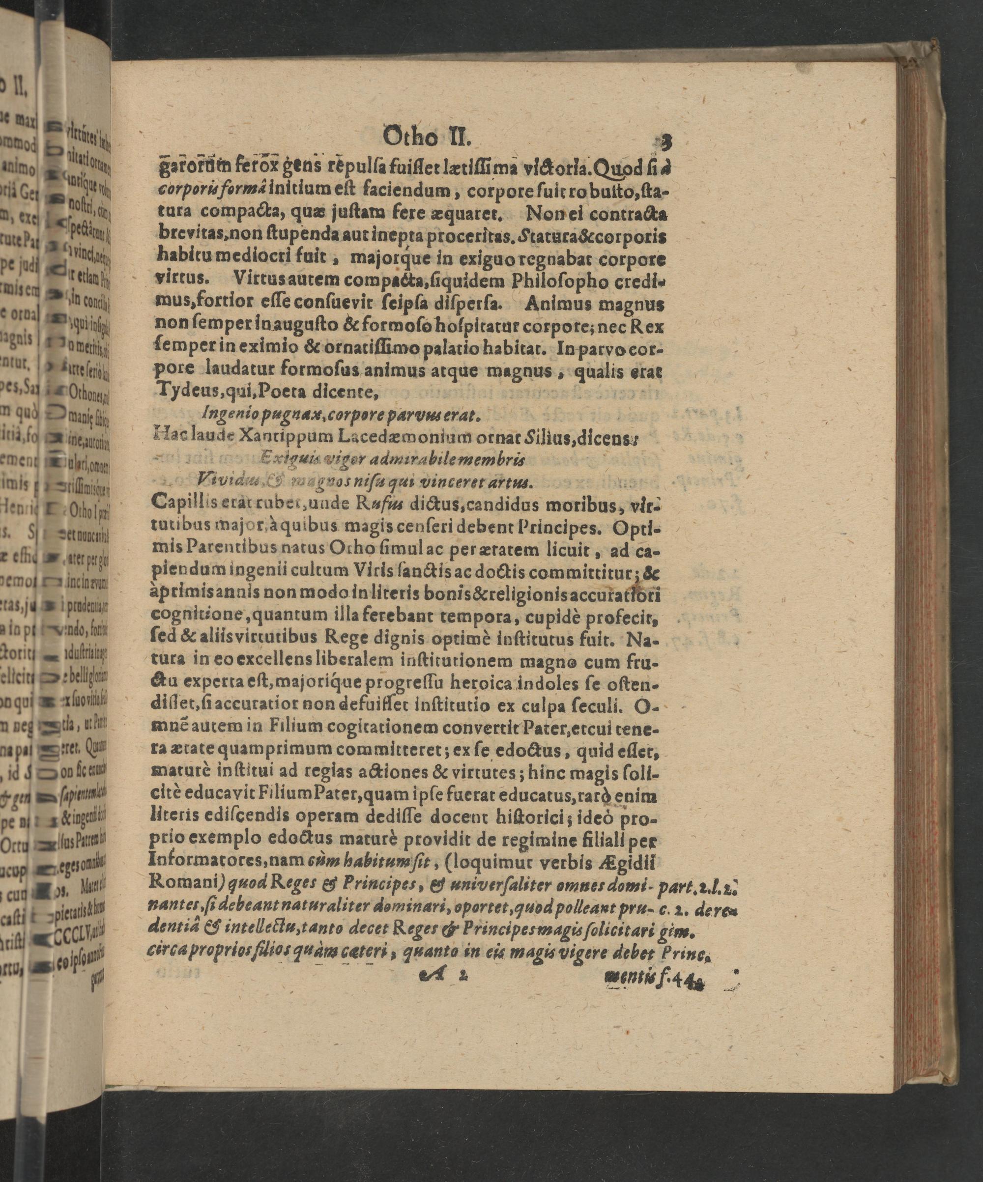 Viuideu,&s uε gnos niſa qui vinceret artuu9.— Capillis erar raber, unde Rufus dictus, candidus moribus, vir- tutibus major, àquibus magis cenſeri debent Principes. Opti- mis Parentibus natus Ocho ſimulac per æratem licuit, ad ca- piendum ingenii cultum Viris ſanctis ac doctis committitur;& aprimis annis non modo inliteris bonis&religionis accurattori cognitione, quantum illa ferebant tempora, cupidè profecit, ſed& aliis virtutibus Rege dignis optimè inſtitutus fuit. Na- tura in eo excellens liberalem inſtitutionem magno cum fru- ctu experta eſt, majoriq́ue progreſſu heroica indoles ſe oſten- diſſet, ſi accuratior non defuiſſet inſtitutio ex culpa ſeculi. O- mnẽ autem in Filium cogitationem convertit Pater, etcui tene- ra ætate quamprimum committeret; ex ſe edoctus, quid eſler, maturè inſtitui ad regias actiones& virtutes; hinc magis ſoli- citè educavit Filium Pater, quam ipſe fuerat educatus, rarò enim literis ediſcendis operam dediſſe docent hiſtorici; ideò pro- prio exemplo edoctus maturè providit de regimine filiali per Informatores, nam cum habitumſit,(loquimut verbis Egidii