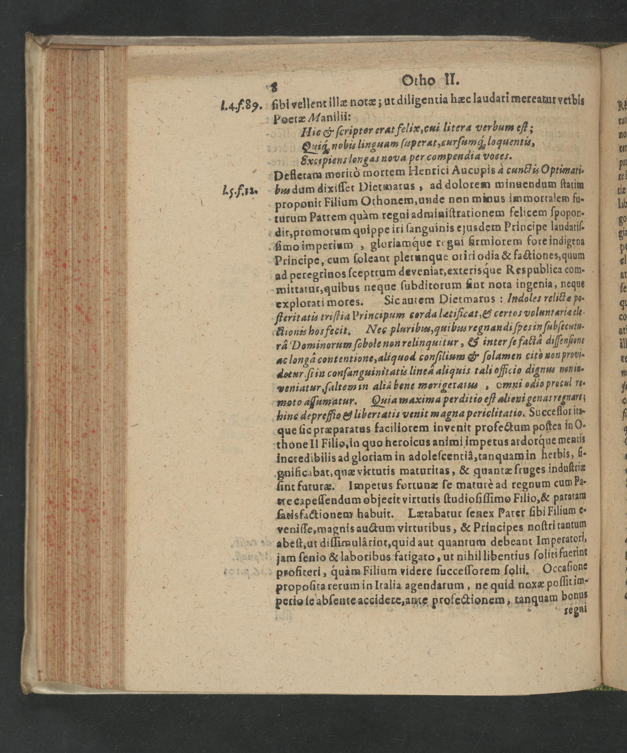 Principe, eum ſoleant plerunque oriri odia& factiones, quum ad petegrinos ſceptrum deveniat, exterisque Respubliea eom. mittatut, quibus neque ſubditorum fint nota ingenia, nequs explorati mores. Sic autem Dietmarus: Indoles relittæ po- ſteritatis triſtia Principum corda læcificat,& certos voluntariæ ele. lionis hos fecit. Nes pluribus, quibus regnandi ſperin ſubſecutu. r Dominorum ſobole non relinquitur,& inter ſc factd diſſenſions ac longà contentione, aliquod conſilium& ſolamen citò uon provi. detur. ſt in conſanguinitatis lined aliqui: tali officio dignus nonis- peniatur, ſaltem in alià bene morigeratus, omni odio procul re- moto aſumatur. Quia maxima perditio eft alieui genau regnati hine deprefio& libertatis venit magna periclitatio. Succe ſlor itꝛ· que ſic præparatus faciliorem invenit profectum poſtes in O- thone II Filio: in quo heroicus animi impetus ardorqꝗue meniis incredibilis ad gloriam in adoleſcenti, tanquam in herbis, 3 gniſicabat, quæ virtutis maturitas,& quantæ ſruges inquſttie ſint fatura. Impetus fottunæ ſe maturè ad regnum cum Pa· ete capeſſendum objecit virtutis ſtudioſiſſimo Filio,& patatam ſacisfactionem habuit. Lætabatur ſenex Pater ſibi Filium e- veniſſe, magnis auctum virtutibus,& Principes noſtri tantum abeſt, ut diſſimulàrint, quid aut quantum debeant Imperatori, jam ſenio& labotibus fatigato, ut nihil libentius ſoliti fuerint
