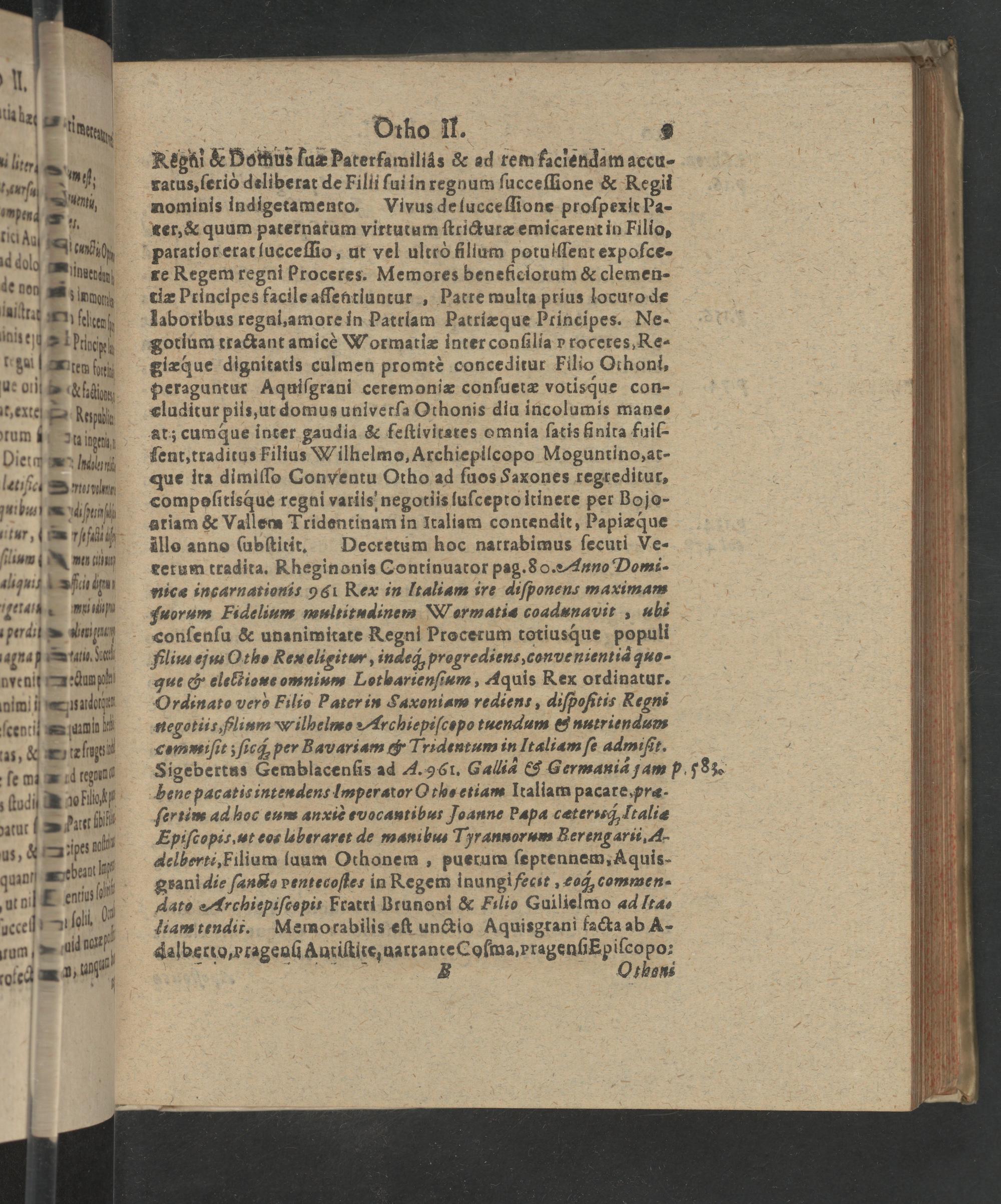 laboribus regni, amore in Patriam Patriæque Principes. Ne- gotium tractant amicè Wormatiæ inter conſilia proceres Re- giæque dignitatis culmen promtè conceditur Filio Othoni, peraguntur Aquiſgrani ceremoniæ conſuetæ votisque con- cluditur piis, ut domus univerſa Othonis diu incolumis mane- atz cumque inter gaudia& feſtivitates omnia ſatis finita fuiſ- ſent, traditus Filius Wilhelme, Archiepilcopo Moguntino, at- que ira dimiſſo Gonventu Otho ad ſuos Saxones regreditur, compoſitisque regni variis, negotiis luſcepto itinere per Bojo- ariam& Vallem Tridentinam in Italiam contendit, Papiæque ällo anno(ubſtitit. Decretum hoc narrabimus ſecuti Ve- retum tradita. Rheginonis Continuator pag. 80. Anuno Domi- nicæ incarnationis 961 Rex in Italiam ire diſponens maximan Juorum Fidelium multitadinens Marmatis coadunavit, uli conſenſu& unanimitate Regni Procerum totiusque populi filius ejus Otho Rex eligitur, indeq;, progrediens, conve nientid quo- que& elelt ioue omnium Lotbarienſium, Aquis Kex ordinatur. Ordinato verꝰ Filio Pater in Saxoniam rediens, diſpofitis Regni negotiis, plium w'ilbelms Archiepiſcepo tuendum& nutriendum commiſit; ſicq; per Bavariam& Tridentum in Italiam ſe admiſit.