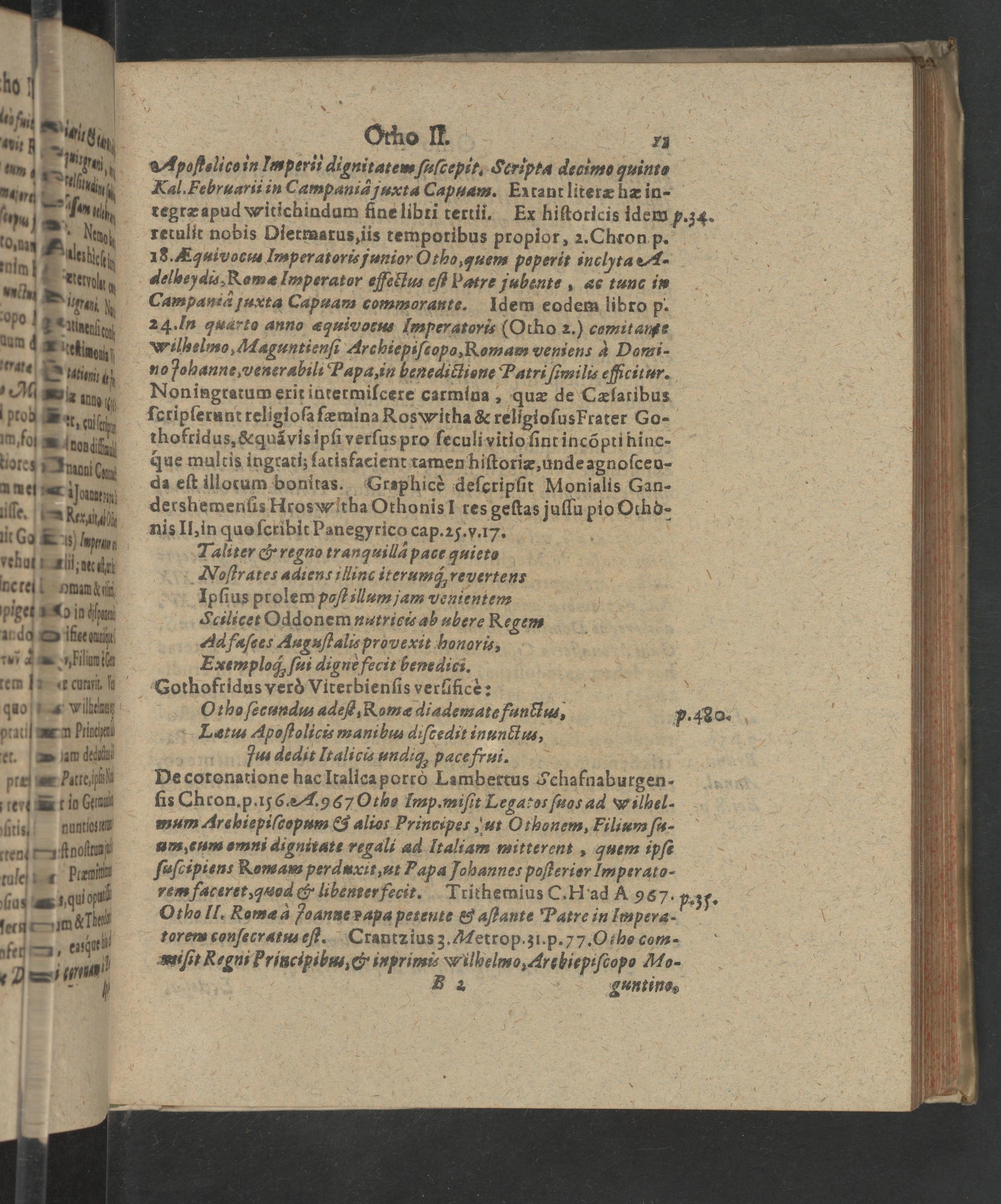 18. uivocus Tperatoris funior Otho, quem peperit inclyta A. delbey dis, Remæ Imperator effectus eſt Patre jubente, e tunc in Campaniàâ juxta Capuam commorante. Idem eodem libro p. 24:In quarto anno æquivogus Imperatoris(Otho z.) comitame Wilbelmo, Maguntienſi Archiepiſcopa, Romam veniens à Domi- no fohanne, venerabili Papa, in benedictione Patri ſtmilis efficitur. Noningratum erit intermiſcere carmina, quæ de Cælaribus ſeripſerunt religioſa ſæmina Roswitha& religioſus Frater Go- thofridus,& quãvis ipſi verſus pro ſeculi vitio ſint incõpti hinc- que multis ingrati; ſacisfacient tamen hiſtoriæ, unde agnoſceu- da eſt illorum bonitas. Grsphicè deſcripfit Monialis Gan- dershemenlis Hroswitha Othonis] res geſtas juſſu pio Othd- nis Il, 2in quo ſcribit Panegyrico cap. 25. v. ⁷.