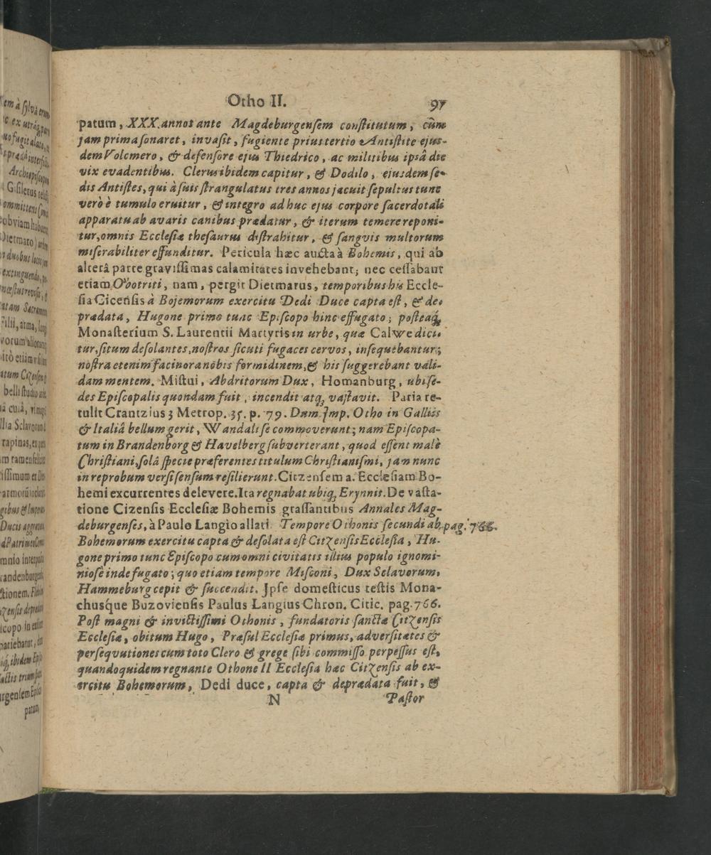 Bohemorum exercitu capta& deſolata eſt Cit enſis Ecbleſia, Mu. gone primo tunc Spiſcopo cumomni civitatis illius populo ignomi- nioſe inde fugato; quo etiam tempare Miſconi, Dux Selavorum, Hammeburg cepit& ſuccendit. Ipſe domeſticus teſtis Mona- chusque Buzovienfis Paulus Langius Chron. Citic. pag. 766. Poſt magni& in viltiſſimi Othonis, fundatoris ſantiæ(it⁊ enſis Eecleſiæ, obitum Hugo, Præaſul Eccleſiæ primus, adverſitætes& perſeqvutioner cum toto Clero& grege ſibi commiſſo perpelſus eſt, quandoquidem regnante Othone Il Eceleſia hæc Cit enſi⸗ a6 ex- ercitu Bohemorum, Dedi duce, capta& depradata fuit,& 10. Os 1 N Peſger