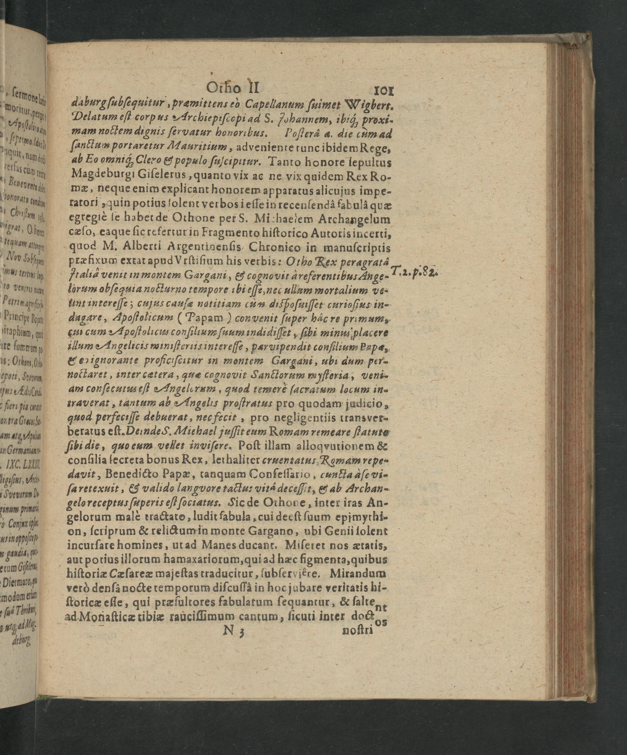 Ofho I. 101 daburg ſubſequitur, præmittens eo Capellanum ſuimet VWig bert. Delatum eſt corp us rchiepiſcopi ad S. Fobannem, ibiq proxi- mam noctem dignis ſervatur honoribus. Poſterâ a. die cùm ad ſanctum portaretur Mauritium, adveniente tunc ibidem Rege, ab Eo omniq; Clerxo& populo ſuſcipitur. Tanto honote le pultus Magdeburgi Giſelerus, quanto vix ae ne vix quidem Rex Ro- mæ, neque enim explicant honorem apparatus alicujus impe- ratori, quin potius ſolent verbos i eſſe in recenſendà fabulà quæ egregiè ſe habet de Othone per S. Michaelem Archangelum cæſo, eaque ſic refertur in Fragmento hiſtorico Autoris incerti, quod M. Alberti Argentinenſis Chronico in manuſecriptis præfixum extat apud Vrſtiſium his verbis: Otho Rex peragrata 7.2. p. 92. lõörum abſequia nocturno tempore hi eſſe, nec ullum mortalium ve- lint intereſſe; cujus cauſæ natitiam cuas dis Poſuiſſet curisſius in- dagatre, Apoſtolicum(Papam) con venit ſuper häc re primaum. cus cum Mpoſtolicus conſilium ſuum indidiſſet, ſibi minus placere illum eAn gelicis winiſteriis intereſſe, pPær uipendit conſilium Papæ, E enignorante proficiſcitur in montem Gargani, ubi dum per- noctaret, inter cætera, auæ cogno vit Canctorum myfforia, vVeni⸗ am conſecutus eſt Angelerum, quod temerè ſacratum locum in- traverat, tantum ab Aingslis proſtratus pro quodam jadieio,