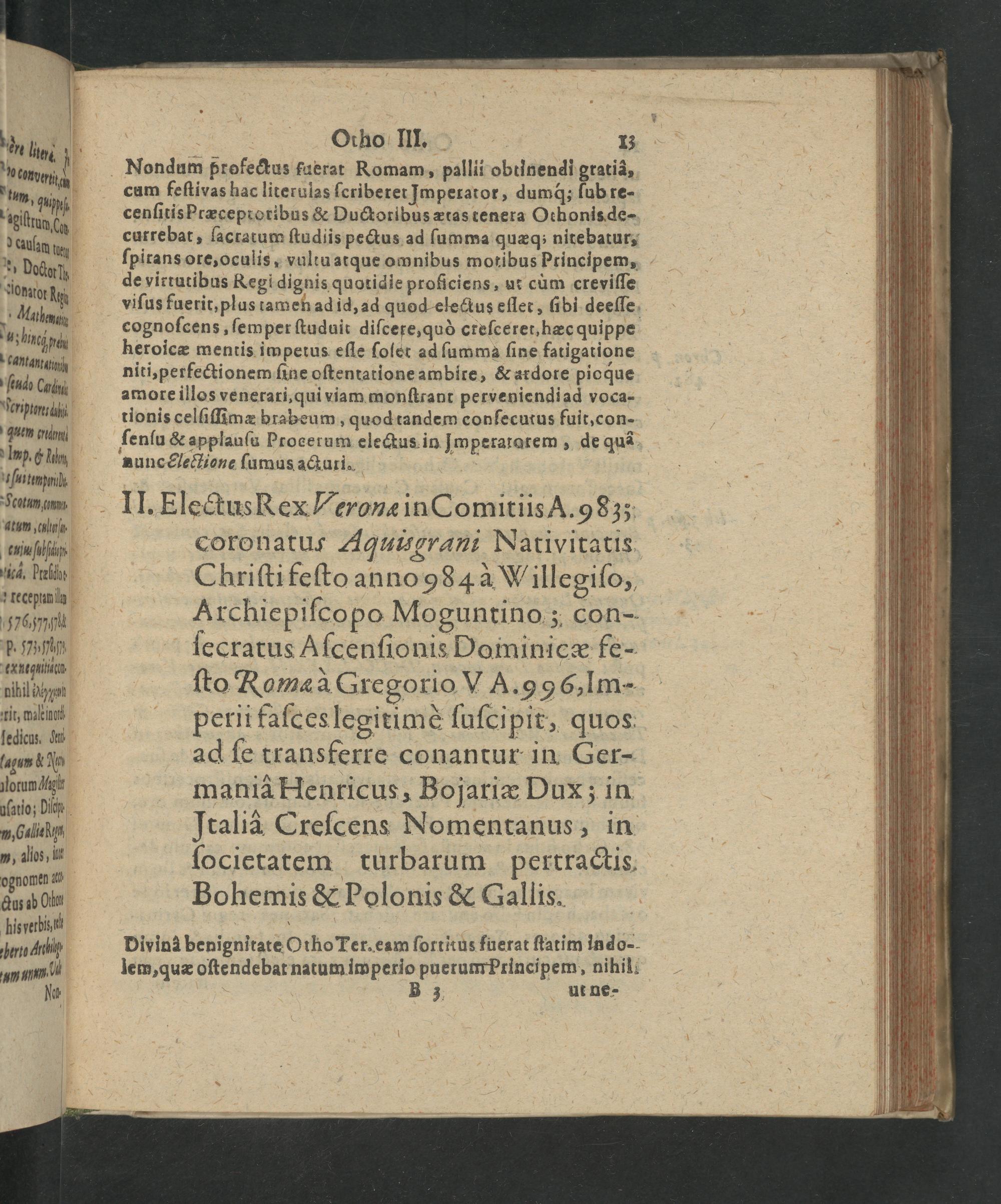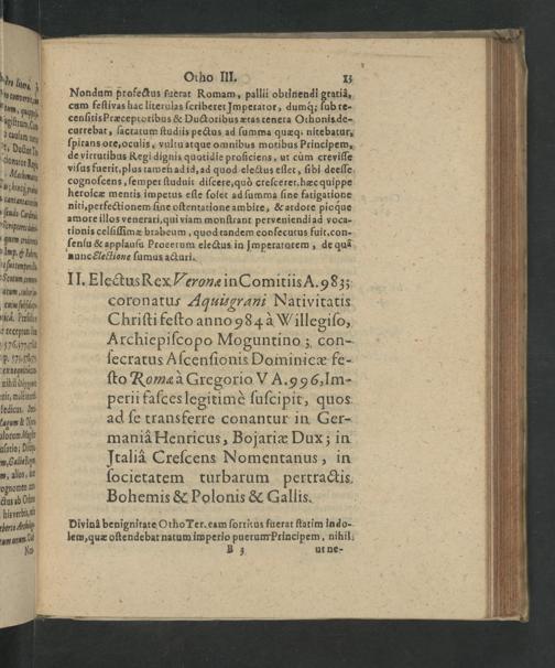 II. Electus Rex Veronæ in Comitiis A. 983; coronatus Aquiuszgrani Nativitatis Chriſti feſto anno984 à Willegiſo, Archiepiſco po Moguntino; con- ſecratus Aſcenſionis Dominicæ fe- ſto Roma à Gregorio VA. 9 96,1m- perii faſces legitimè ſuſcipit, quos ad ſe transferre conantur in Ger- maniâ Henricus, Bojariæ Dux; in Italid Creſcens Nomentanus, in ſocietatem turbarum pertractis, Bohemis& Polonis& Gallis.