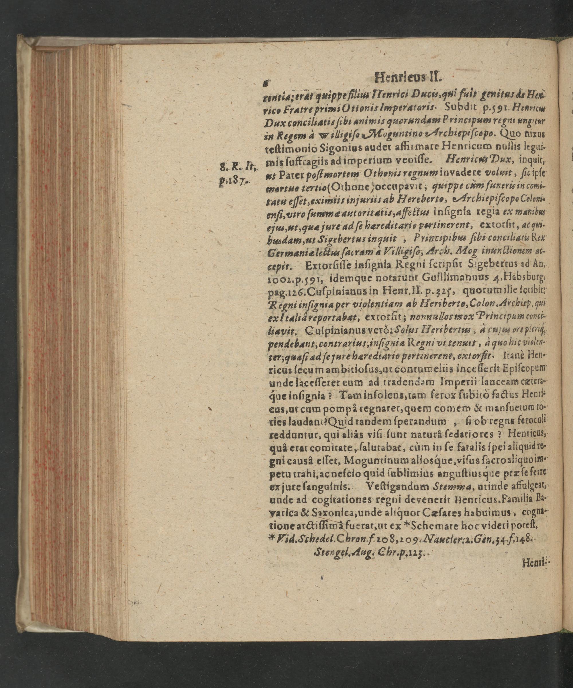 „ Henrieus II. tentiar erat quippe filiu IIenrici Dutis, qui fuit genitus di Her rice Fratre primi Ottoni. lmperatoris. Subdit p.5or Henricu Dax conciliatis ſibi animis quorundam rincipum regm ungitur in Regem à w illigiſo Moguntino Mrchiepiſcapo. Quo nixus teſtimonio Sigonius audet affirmare Henricum nullis legui- mis ſuffcagiis ad imperium veuiſſe. Henricua Dux, inquit ut Pater poſt mortem Othonis regnum invadere voluit, ſic ipſe mortus tertio(Othone joccupavit; quippe cum funeris in comi. tatu eſſet, eximiis injuriis ab Hereberto, Archiepiſcopo Coloni. enſi, uiro ſummæ autoritatis, affectus inſignia regia ex manibus ejus, ut, quæ jure ad ſe hæréditario pertinerent, extorſit, ad ui. husdam, ut Sige bertus inquit, Principibus fibi conciliatis Rex