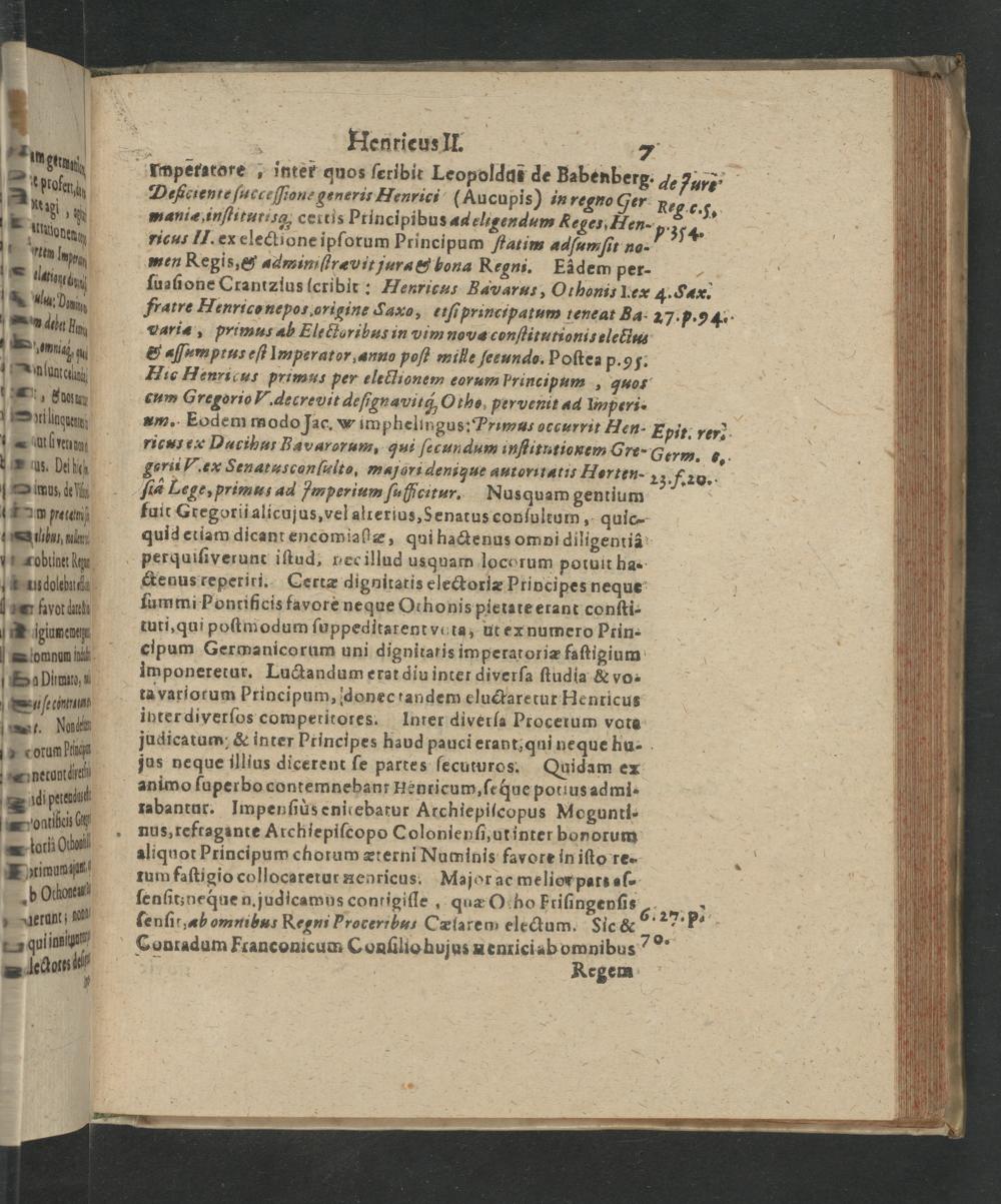 . Henrieus II. 7 Tmperatore, inter quos ſeribit Leopoldut de Babenberg. 7, 2aν Daßictente ſucceſſione generis Henrici(Aucu pis) in regno ger Reg c.5, maniæ inſtitutisg, certis Ptincipibus ad eligendum Reges, Hen-„ 354. 3 ricu., II. ex electione ipſorum Principum ſtatim adſum ſit no- men Regis,& ⸗dminiſtrævit jura& bona Regni. Eadem per- ſuaſione Crantzlus ſcribit: Henricus Bavarus, Othanis Leaæ 4. Sax. Fratre Henrico nepos, origine Caxo, eiſi principatum teneat Ba. 27. p.)4. variæ, primus ab Electuribus in vim novæ conſtitutionis electus & Gumptur eſt Imperator, anno poſt mile ſeeundo. Poſtea p. 9 ·. Nie Henricus primas per eleclionem eorum Principum, quo⸗r