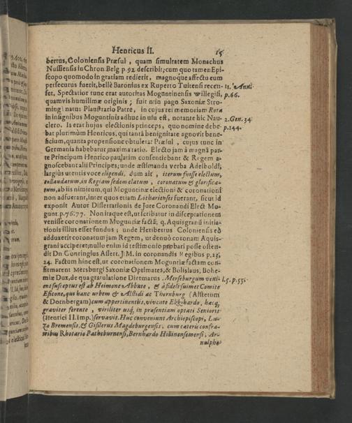 largiùs urentis voce eligendi, dum ait, iterum fuiſſe elecium, tollaudatum, in&egiam ſedem elatum, coronatum& glorifica= tum, ab iis nimirum, qui Moguntinæ electioni& coronationi non adfuerant, inter quos eriam Lotharienſes fuerant, ſicut id exponit Autor Diſſertationis de Jure Coronandi Elect Mo- gunt. p. 76.77. Non itaque eſt, ut ſcribatur in diſceptationem veniſſe coronationem Moguntiæ factã, q. Aquisgranũ iniria- tionis illius eſſer fundus; unde Heribertus Colonienſis es adduxerit coronatum jam Regem, ut denuò coronam Aquis- grani acciperetznullo enim id teſtimonio probari poſſe oſten- dit Dn. Conringius Aſſert.) M. in coronandis k egibus p. 235 24. Factum hinc eſt, ut coronationem Moguntiæ factam coH- firmarent Mersburgi Saxoniæ Optiwates,&e Bolislaus; Bohe-