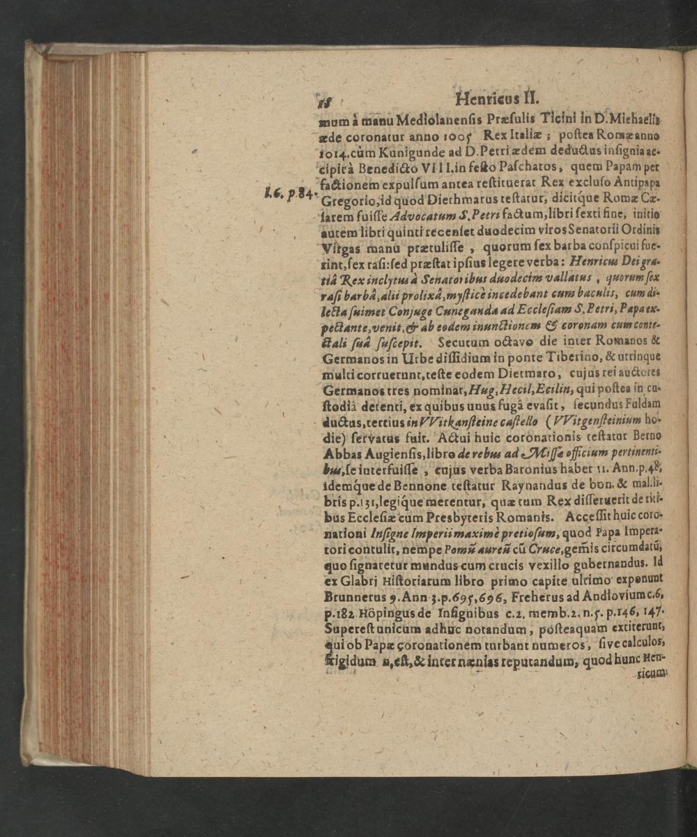 77 Henrieus II. b mum à manu Medlolanenſis Præſulis Tieini in D. Miehaelts xæde coronatur anno 100 KRex ltaliæ; poſtes Romæ anno 4 1014. cum Kunigunde ad D. Petriædem dedudus inſignia ae- cipieà Benedicto VIII.in feſto Paſchatos, quem Papam per 16. 84-Hctionem expulſum antea reſtituerat Rex excluſo Antipapa Gregorio, id quod Diethmarus teſtatur, dicitque Romæ Cæ- jarem fuiſſe Advocatum S. Petri factum, libri ſexti fine, initio autem libti quinti recenſet duodecim viros Senatorii Ordinis Virgas wanu prætuliſſe, quorum ſex barba conſpicui fae- rint, ſex raſi: ſed præſtat ipſius legere verba: Henricus Dei gra- riâ Rex inclytus à Senatot ibus duodecim vallatus, quvrum ſes raſi barbd, alii prolixd, myſticè ingedebant cun baculis, cum di⸗ lecta ſuimet Conjugs Cunegunda ad Eccleſiam§. Petri, Papa ex. pettante, venit,& ab eodem inunctionem& coronam cum conts- ftali ſuà ſuſcepit. Secutum octavo die inter Romanos&