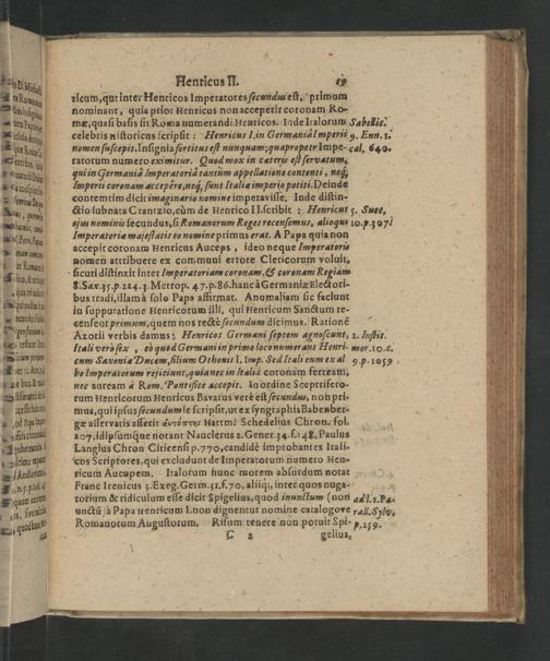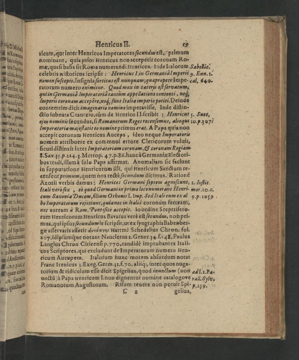 8.Sax. 35, p. 224. 3. Metrop. 47.p. 86. hanc à Germaniæ Electori- bus tradi, illam à ſolo Papa affirmat. Anomaliam ſic faciunt in ſupputatione Henricorum illi, qui Henrieum Sanctum re- cenſent primum, quem nos rectè ſecundum dicimus. Rationẽ Azorli verbis damus: Heuricor Germani ſeptem agnoſcunt, 2. Iuſtit. Itali verò ſex, eò quod Germani in primo loconumerant Henri mor. 10,g. cum Saxoniæ Dacem, filium Othonui- I. Imp. Sed Itali eum ex al 9 p. 1059 bo Imperatorum reſjiciunt, quia nec in ſtalià coronam ferream, nec auream à Rom. Pont tſice accepit. In ordine Sceptrifero- rum Henricorum Henricus Bavarus verè eſt αᷣαus, non pri- mus, qui ipſus ſecundum ſe ſeripſit, ut ex ſyngraphis Babenber- gæ aſſervatis aſſerit avrdxτντ artm! Schedelius Chron. fol. 107, idipfumq́ue notant Nauclerus 2. Gener. 34 f. 4½, Paulus Langius Chron Citicenſi p. 770, candidè improbantes Itali- cos Scriptores, qui excludunt de Ilmperarorum numero Hen- ricum Aucupem. Italotum hunc morem abſurdum notat Franc Irenicus 3. Exeg. Germ. z1. f.70, aliiq́, intet quos nuga- 8 torium& ridiculum eſſe dicit Spigelias, quod inunctum(non a41.2. Ps- anctũ jà Papa nenricum I. non dignentut nomine catalogove rall. Sylv. KRomanorum Auguſtorum, Riſum tenere non potuit Spi-„ 253. L 282 gelius,
