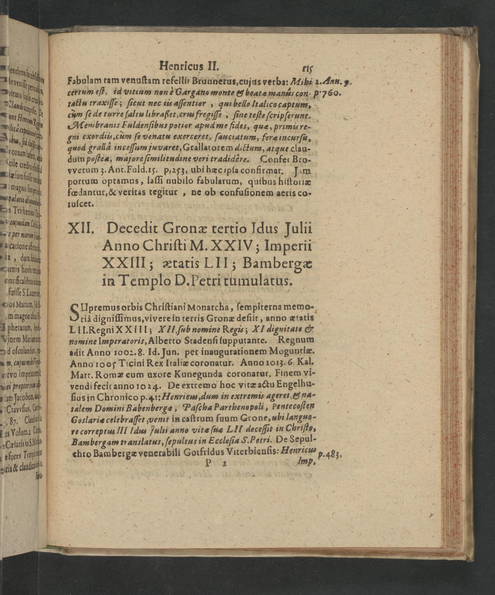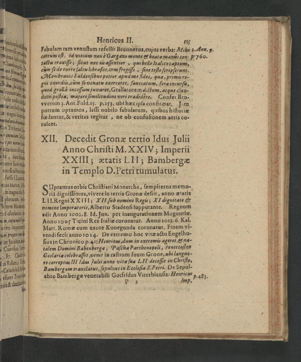 XII. Decedit Gronæ tertio Idus Julii Anno Chriſti M. XXIV; Imperii XXIII; ætatis LII; Bambergæ in Templo D. betri tumulatus.