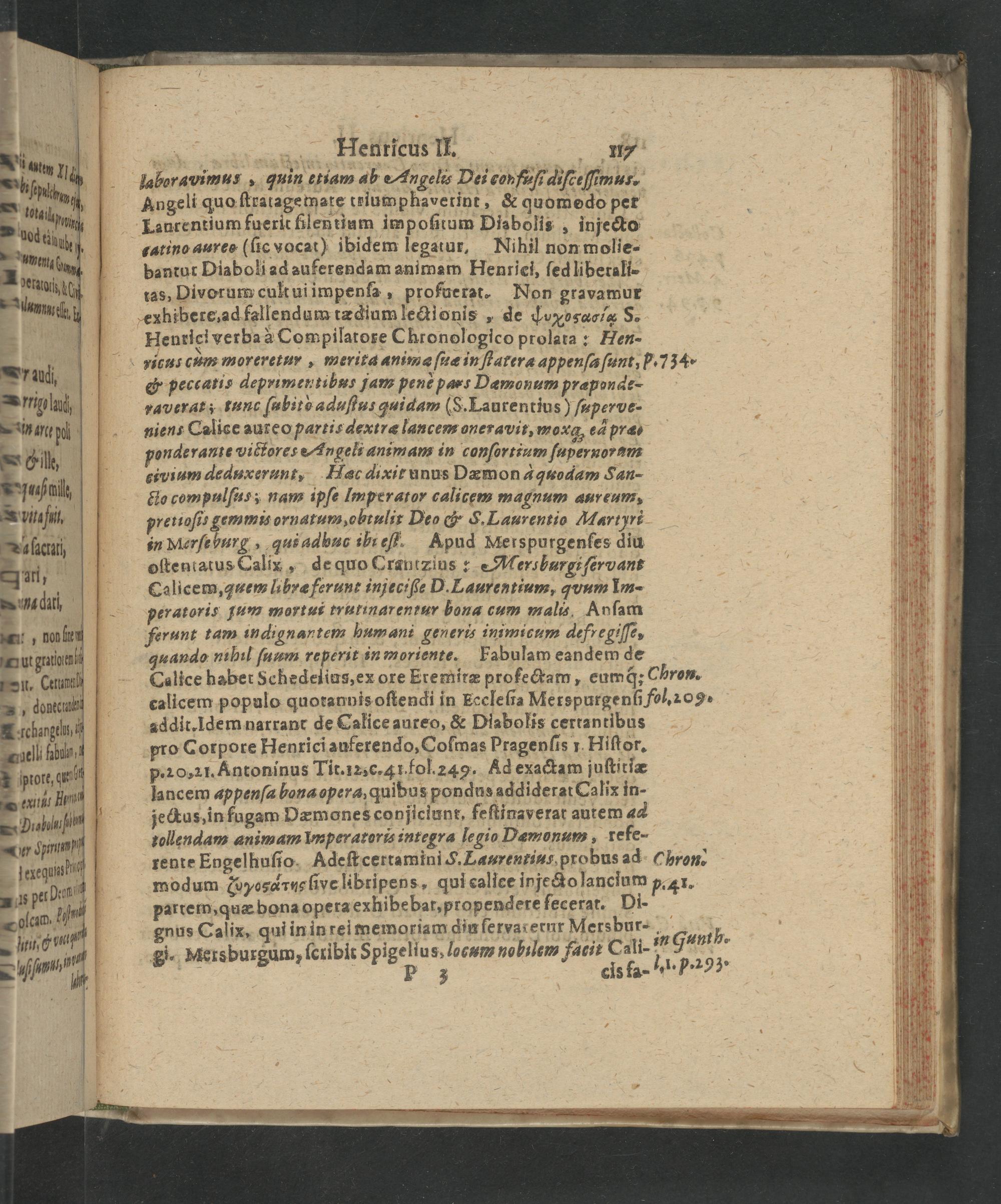 & peccatis deprimentibus jam penè pars Dæmonum praponde- raverat; tunc ſubitè aduſius quidam(§. Laurentius) ſuperve- niens Calise aureo partis dextræ lancens oneravit, moxg. ed pra- po nderante victores Angeli animam in conſortium ſupernoram civium deduxerunt, Hac dixit unus Dæmon A quodam San- Co compulſus; nam ipſe Imperator calictem magnum aur eum, retioſis gemmis ornatum, obtulit Deo&&. Laurentio Martyri in Merſe burg, qus adbuc ibi&ſt. Apud Merspurgenſes diu oſtentatus Calix, de quo Crantzius: Mer⸗ burgi ſervant Calicem, quem libræ ferunt injeciße D. Laurentium, vum Im- peratoris um mortui trutinarentur bona cum malis. Anſam ferunt tam indignantem humani generis inimicum defr egiſſe, uando nihil ſuum reperit in moriente. Fabulam eandem de
