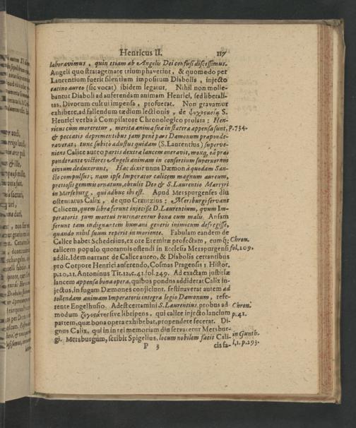 PHenricus II. II7 laboravimus, quin etiam ab eAngelts Dei con fiuſi aiſce ſimur. Angeli quo ſtratagemate triumphaverint,& quomedo per Laurentium fuerit filentium impoſitum Diabolis, injecto tatino aureo(ſic vocat) ibidem legatur, Nihil non molie- bantur Diaboli ad auferendam animam Henrie:i, ſed liberali- tas, Divorum cult ui impenſa, profuerat. Non gravamur exhibere, ad fallendum tædium lectionis, de ννπμνᷣκσ S. Henriciverba à Compilatore Chronologico prolata: Hen-