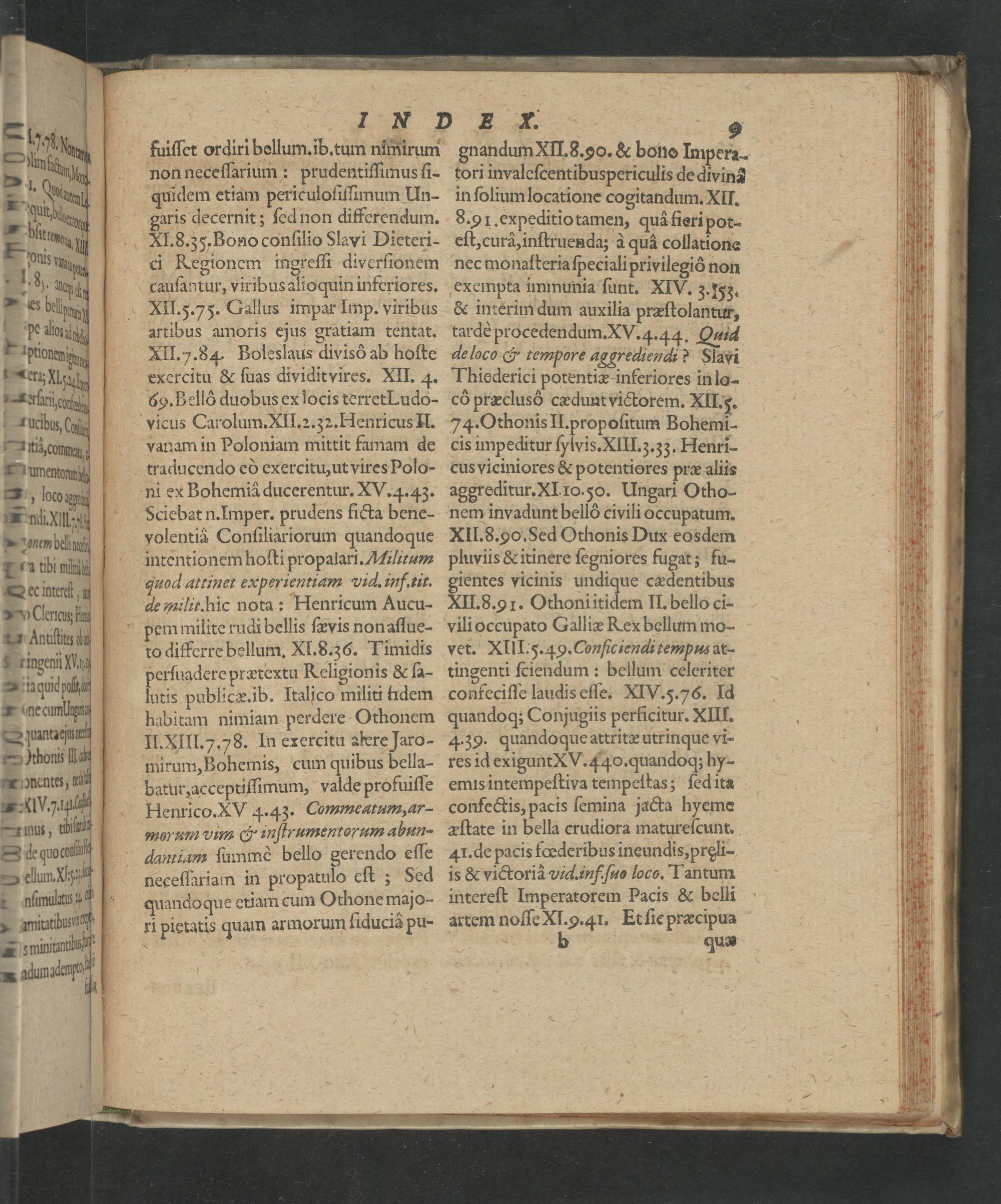 Sciebat n. Imper. prudens ficta bene- volentià Conſiliariorum quandoque intentionem hoſti propalari. Milirum quod attinet experientiam vid. inf. tit. de milit. hic nota: Henricum Aucu- pem milite rudi bellis ſævis non aſſue- to differre bellum. XI. 8.36. Timidis perſuadere prætextu Keligionis& ſa- lutis publicæ. ib. Italico militi lidem habitam nimiam perdere Othonem II. XIII. 7.78. In exercitu atere Jaro- mirum, Bohemis, cum quibus bella- batur, acceptiſſimum, valde profuiſſe Henrico. XV 4. 43. Commeatum, ar- morum vim& inſtrumentorum abun- dantiam ſummè bello gerendo eſſe neceſſariam in propatulo eſt; sed quandoque etiam cum Othone majo- ri pietatis quam armorum fiducià pu-