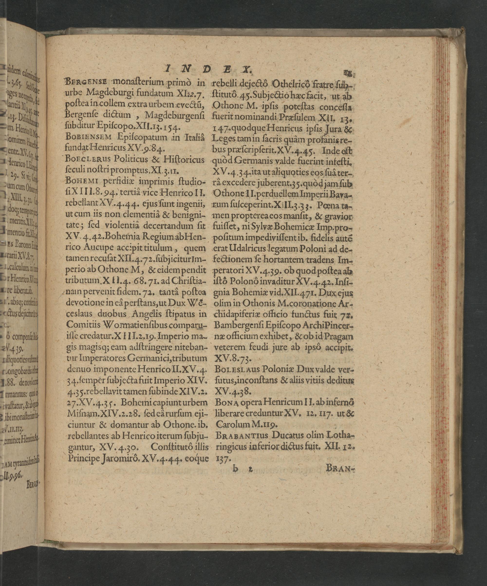 XV. 4.3 4.ita ut aliquoties eos ſuà ter- rà excedere juberent.ʒ5. quòd jam ſub Othone II. perduellem Imperii Bava- rum ſuſceperint. X II. 33 3. Pœna ta- men propterea eos manſit,& gravior fuiſſet, ni Sylvæ Bohemicæ Imp.pro- poſitum impediviſſent ib. fidelis autẽ erat Udalricus legatum Poloni ad de- fectionem ſe hortantem tradens Im- peratori XV. 4. 39. ob quod poſtea ab iſtè Polonò invaditur XV. 4. 42. Inſi- gnia Bohemiæ vid. XII. 471. Dux ejus olim in Othonis M. coronatione Ar- chidapiferiæ officio functus fuit 7½. Bambergenſi Epiſcopo Archibincer- næ officium exhibet,& ob id Pragam veterem feudi jure ab ipsò accipit. XV.S.7ß. BorEsLAaus Poloniæ Dux valde ver- ſutus, inconſtans& aliis vitiis deditus XV. 4.38. Boxà opera Henricum II. ab infernò liberare creduntur XV. 12. 117. ut& Carolum M. 19. 3 BRABANTIus Ducatus olim Lotha- ringicus inferior dictus fuit. XII. 12.