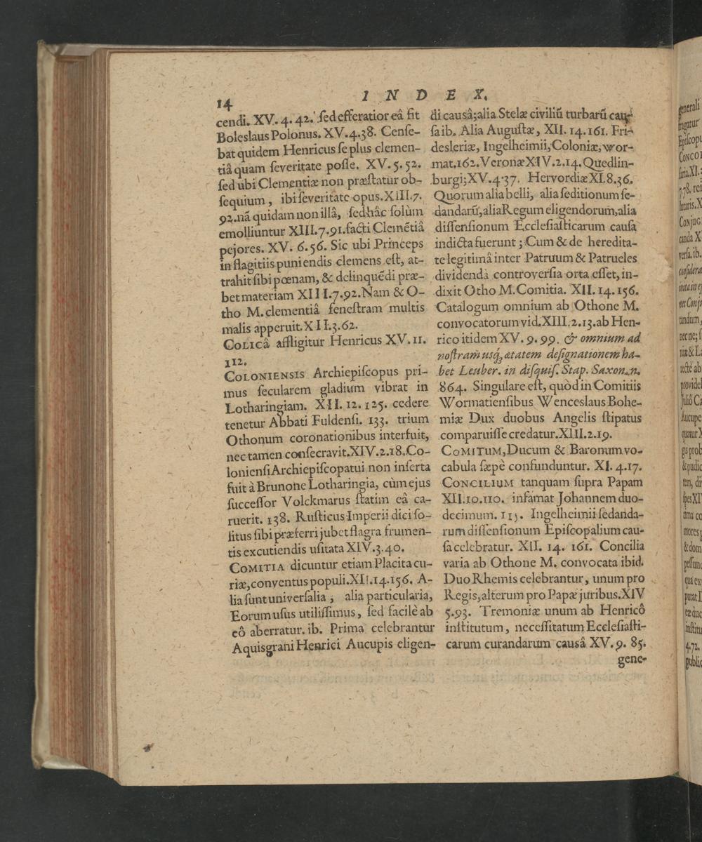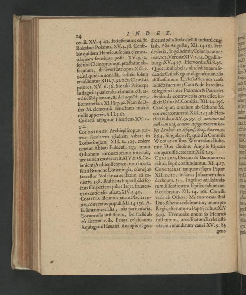 14 1 N D E I1. cendi. XV. 4. 42. ſed efferatior ed fit di causazalia Stelæ civiliũ turbarũ cau Boleslaus Polonus. XV. 4.38. Cenſe- ſaib. Alia Auguſtæ, Xll. 14. 161. Er bat quidem Henricus ſe plus clemen- desleriæ, Ingelheimii, Coloniæ, wor- tià quam ſeveritate poſſe. XV. 5. 52. mat. 162. Veronæ XiV. 2.14. Quedlin- ſed ubi Clementiæ non præſtatur ob- burgi; XV. 437. Hervordiæ X. 8.;6. ſequium, ibi ſeveritate opus. XIII.7. Quorum alia belli, alia ſeditionum ſe- 2. nã quidam non illa, ſedhàc ſolum dandarũ, alia Kegum eligendorum alia emolliuntur XIII. Z. 91. facti Clemẽtiâ diſſenſionum Eccleſiaſticarum cauſa pejores. XV. 6.56. Sic ubi Princeps indicta fuerunt; Cum& de heredita- in flagitiis puniendis clemens eſt, at- te legitimà inter Patruum& Patrueles trahit ſibi pœnam,& delinquẽdi præ- dividenda controverſia orta eſſet, in- bet materiam XIII..92. Nam& O- dixit Otho M. Comitia. XlI. 14.156. cho M. clementid feneſtram multis Catalogum omnium ab Othone M. malis apperuit. X] I. 3. 62. convocatorumvid. XIII.z. 13. ab Hen- CoricCà affligitur Henricus XV. II. rico itidem XV. 9. 99.& omnium ad 11². noſtram usq, atatem deſignationem ha- CoroNIENSIS Archiepiſcopus pri- bet Leuber. in diſquiſ. Stap. Saxon. n. mus ſecularem gladium vibrat in 864. Singulare eſt, quòd in Comitiis Lotharingiam. XII. 12. 125. cedere Wormatienſibus Wenceslaus Bohe- tenetur Abbati Fuldenſi. 133, trium miæ Dux duobus Angelis ſtipatus Othonum coronationibus interfuit, comparuiſſe credatur. XlII. 2.19. nec tamen conſecravit. XIV.z2.18. Co- CoMlTuM¹, Ducum& Baromampo. lonienſi Archiepiſcopatui non inſerta cabula ſæpè confunduntur. XI. 4.17. fuit à Brunone Lotharingia, cùmejus CoxcCrLluN- tanquam ſupra Papam ſucceſſor Volckmarus ſtatim eà ca- XII.10. 10. infamat Johannem duo- ruerit. 138. Kuſticus Imperii dici ſo- decimum. 11). Ingelheimii ſedanda- litus ſibi prætferri jubet flagra frumen- rum diſſenſionum Epiſcopalium cau- tis excutiendis uſitata XIV. z. 40. ſacelebratur. XII. 14. 161. Concilia CoM¹rriA dicuntur etiam Placita cu- varia ab Othone M. convocata ibid. riæ, conventus populi. XII. 4.156. A- Duo Khemis celebrantur, unum pro la ſuntuniverſalia, alia particularia, Kegis, alterum pro Papæ juribus. XIV Eorumuſus utiliſſimus, ſed facilè ab 5.93. Tremoniæ unum ab Henricò c6 aberratur. ib. Prima celebrantur inſtitutum, neceſſitatum Eceleſiaſti- Aquisgrani Henrici Aucupis eligen- carum curandarum causà XV. 9. 85. b Lene⸗