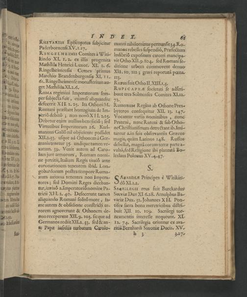 SArauprE Principes Wnikim- ◻ dô XI. I. 2. SAcRiLEeII reus fuit Burckardus Sueviæ Dux X.l 6.28. Arnulphus Ba- variæ Dux. 32. Johannes XII. Pon- tifex ſacra bona meretricibus diſtri- buit XII. 10. 109. Sacrilegi tor- neamentis intereſſe nequeunt. XI. 12. 74. Sacrilegia oriuntur ex ava- ritis Bernhardi Saxoniæ Ducis. XV. kh 3 3-27e
