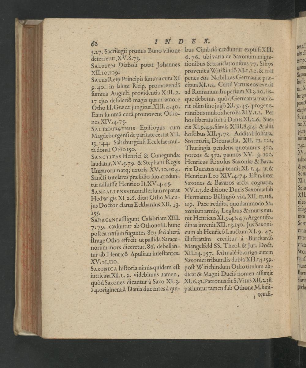 cis Xl. 9. 49. Slavis XIII. 8.9 4.& aliis hoſtibus XII. 5. 73. Addita Holſatia, Stormaria, Dietmarſia. XII. II. 122. Thuringia pendens quotannis 300. porcos& 572. pannos XV. 9. 100. Henricus Kixoſus Saxoniæ& Bava- riæ Ducatus unà tenuit Xl. 1. 4. ut& Henricus Leo XIV. 4.74. Eſtn. inter Saxones& Bavaros arcta cognatio. XV. 13. de ditione Ducis Saxoniæ ſub Hermanno Billingi vid. XII. 11.118.