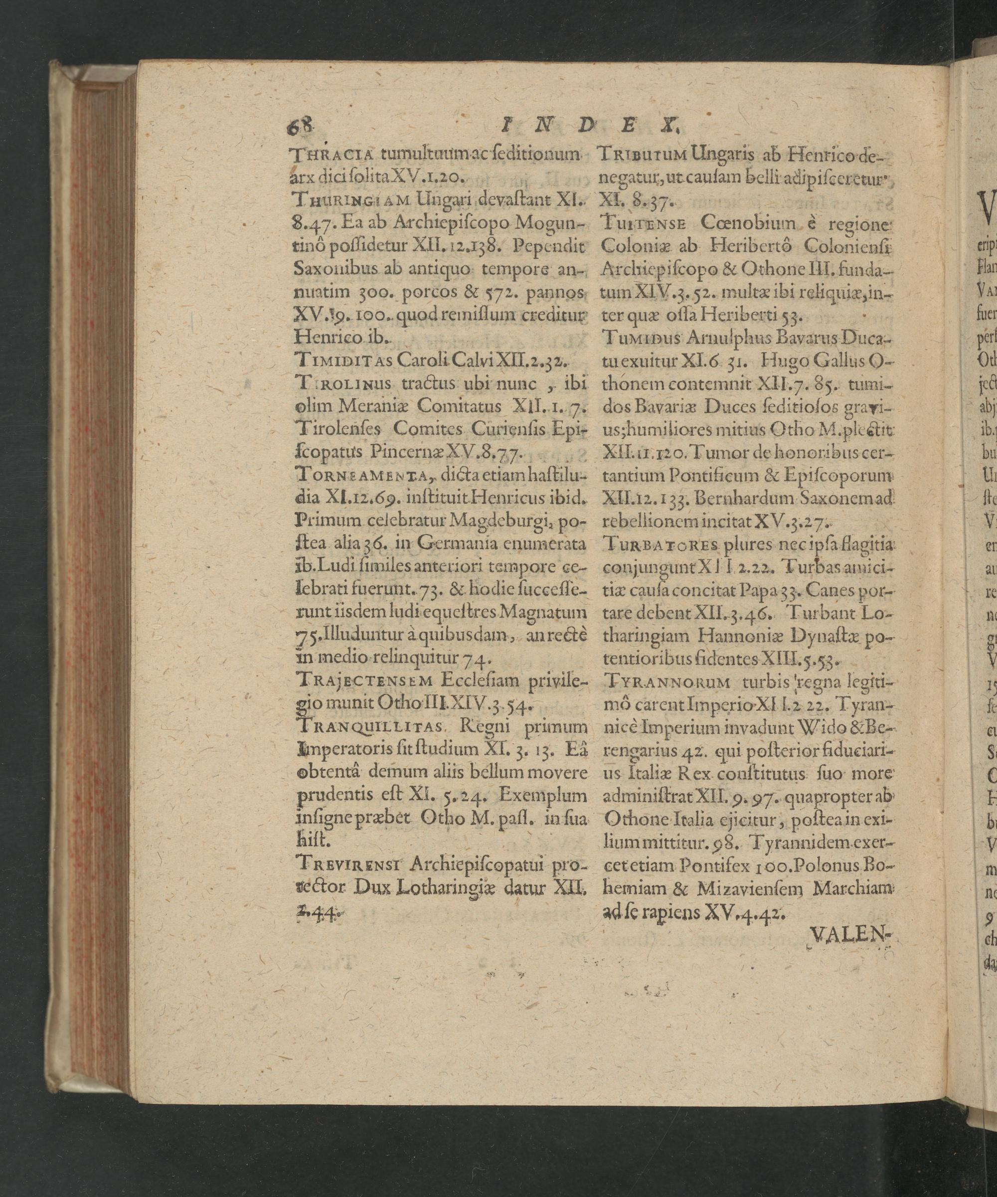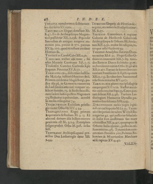THuURINGNAM Ungari devaſtant Xl. 8. 47. Ea ab Archiepiſcopo Mogun- tinò poſſidetur XII. 12.138. Pependit Saxonibus ab antiquo tempore an- nuatim 300. porcos& 572. pannos