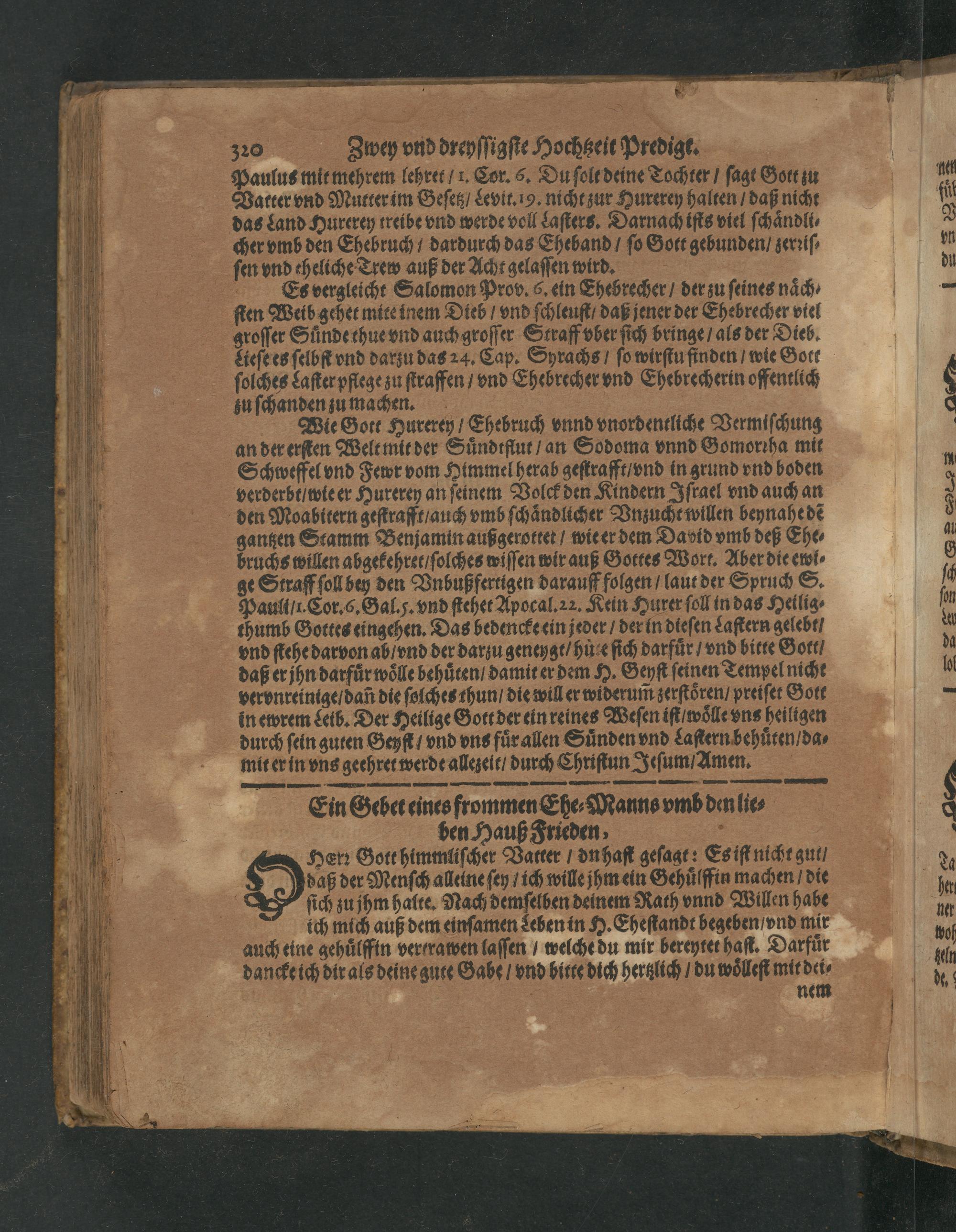 gantzen Stamm Benjamin außgerottet/ wie er dem David vmb deß Ehe⸗ bruchs willen abgekehret/ ſolches wiſſen wir auß Gottes Wort. Aber die ewl⸗ ge Straff ſoll bey den Vnbußfertigen darauff folgen/ laut der Spruch S. Pauli/ Cor. 6. Gal./. vnd ſtehet Apocal. 22. Kein Hurer ſoll in das Heilig⸗ chumb Gottes eingehen. Das bedencke ein jeder/ der in dieſen Laſtern gelebt/ vnd ſtehe darvon ab/ vnd der darzu geneyzt/ huͤ e ſich darfuͤr/ vnd bitte Gott/ daß er jhn darfuͤr woͤlle behuͤten/ damit er dem H. Geyſt ſeinen Tempel nicht vervnreinige/ dañ die ſolches thun/ die will erwiderum zerſtoͤren/ preiſet Gott in ewrem Leib. Der Heilige Gott der ein reines Weſen iſt/ woͤlle vns heiligen durch ſein guten Geyſt/ vnd vns fuͤr allen Suͤnden vnd Laſtern behuͤten/ da⸗ mit er in vns geehret werde allezeit/ durch Chriſtun Jeſum/ Amen. Ein Gebet eines frommen Ehe⸗Manns vmb den lie⸗ ben Hauß Frieden, O Gott himmliſcher Vatter/ dnhaſt geſagt: Es iſt nicht gut/