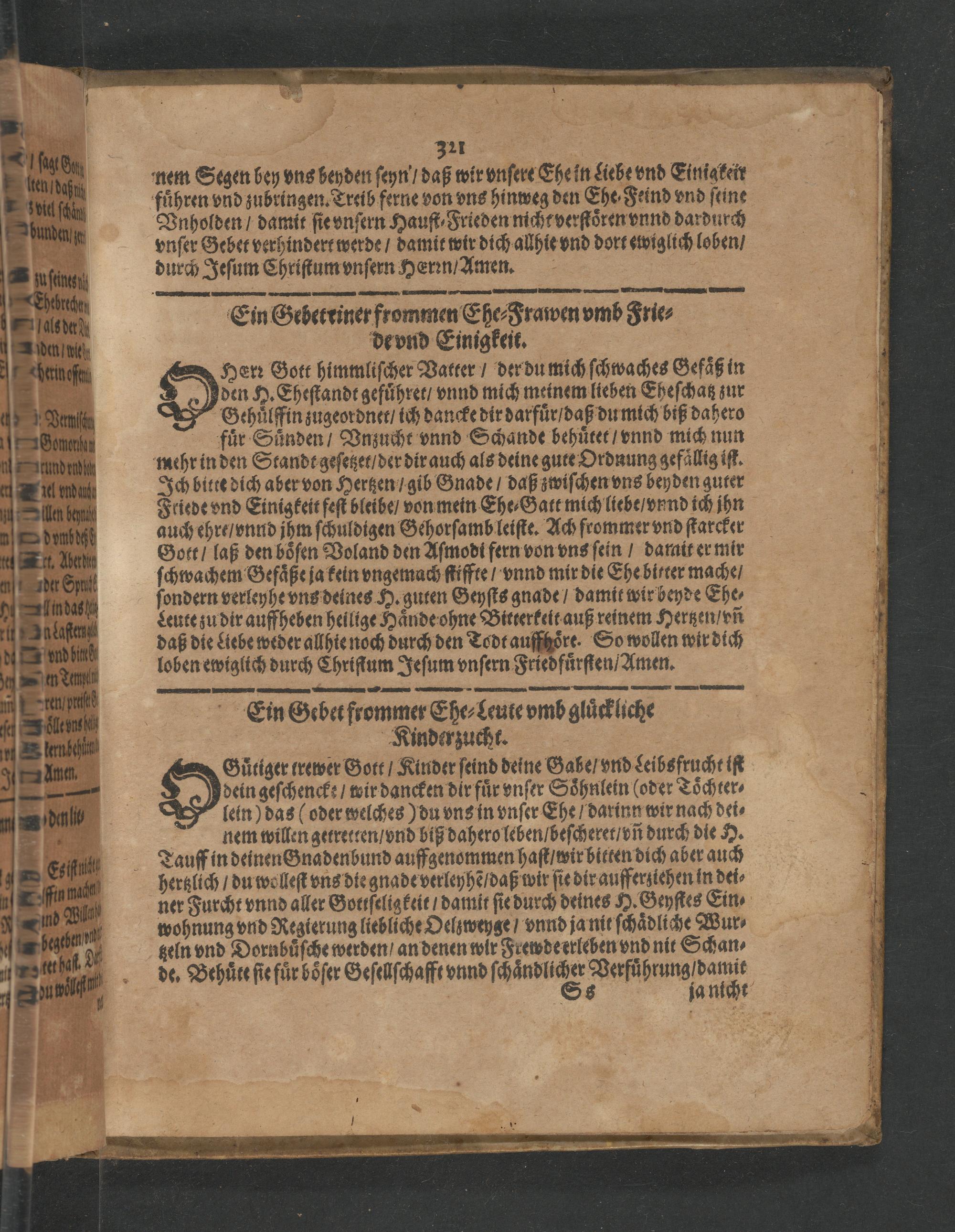„den H. Eheſtandt gefuͤhret/ vnnd mich meinem lieben Eheſchatz zur Gehuͤlffin zugeordnet/ ich dancke dir darfuͤr/ daß du mich biß dahero fuͤr Suͤnden/ Vnzucht vnnd Schande behuͤtet/ vnnd mich nun mehr in den Standt geſetzet/ der dir auch als deine gute Ordnung gefaͤllig iſt. Ich bitte dich aber von Hertzen/ gib Gnade/ daß zwiſchen vns beyden guter Friede vnd Einigkeit feſt bleibe/ von mein Ehe⸗Gatt mich liebe/ vnnd ich jhn auch ehre/ vnnd jhm ſchuldigen Gehorſamb leiſte. Ach frommer vnd ſtarcker Gott/ laß den boͤfen Voland den Aſmodi fern von vns ſein/ damit er mir ſchwachem Gefaͤße ja kein vngemach ſtiffte/ vnnd mir die Ehe bitter mache/ ſondern verleyhe vns deines H. guten Geyſts gnade/ damit wir beyde Ehe⸗ Leute zu dir auffheben heilige Haͤnde ohne Bitterkeit auß reinem Hertzen/ vñ daß die Liebe weder allhie noch durch den Todt auffhoͤre. So wollen wir dich loben ewiglich durch Chriſtum Jeſum vnſern Friedfuͤrſten/ Amen. Ein Gebet frommer Ehe⸗Leute vmb gluͤckliche Kinderzucht. Guͤtiger trewer Gott/ Kinder ſeind deine Gabe/ vnd Leibsfrucht iſt dein geſchenckt/ wir dancken dir fuͤr vnſer Soͤhnlein(oder Toͤchter⸗ y lein) das(oder welches) du vns in vnſer Ehe/ darinn wir nach dei⸗ nem willen getretten/ vnd biß dahero leben/ beſcheret/ vñ durch die H. Tauff in deinen Gnadenbund auffgenommen haſt/ wir bitten dich aber auch hertzlich/ du wolleſt vns die gnade verleyhẽ/ daß wir ſie dir aufferziehen in dei⸗ ner Furcht vnnd aller Gottſeligkeit/ damit ſie durch deines H. Geyſtes Ein⸗ wohnung vnd Regierung liebliche Oelzweyge/ vnnd ja nit ſchaͤdliche Wur⸗ tzeln vnd Dornbuͤſche werden/ an denen wir Frewdeerleben vnd nit Schan⸗ de. Behuͤtt ſie fuͤr boͤſer Geſellſchafft vnnd ſchandliche Berſuhruns d u a nicht