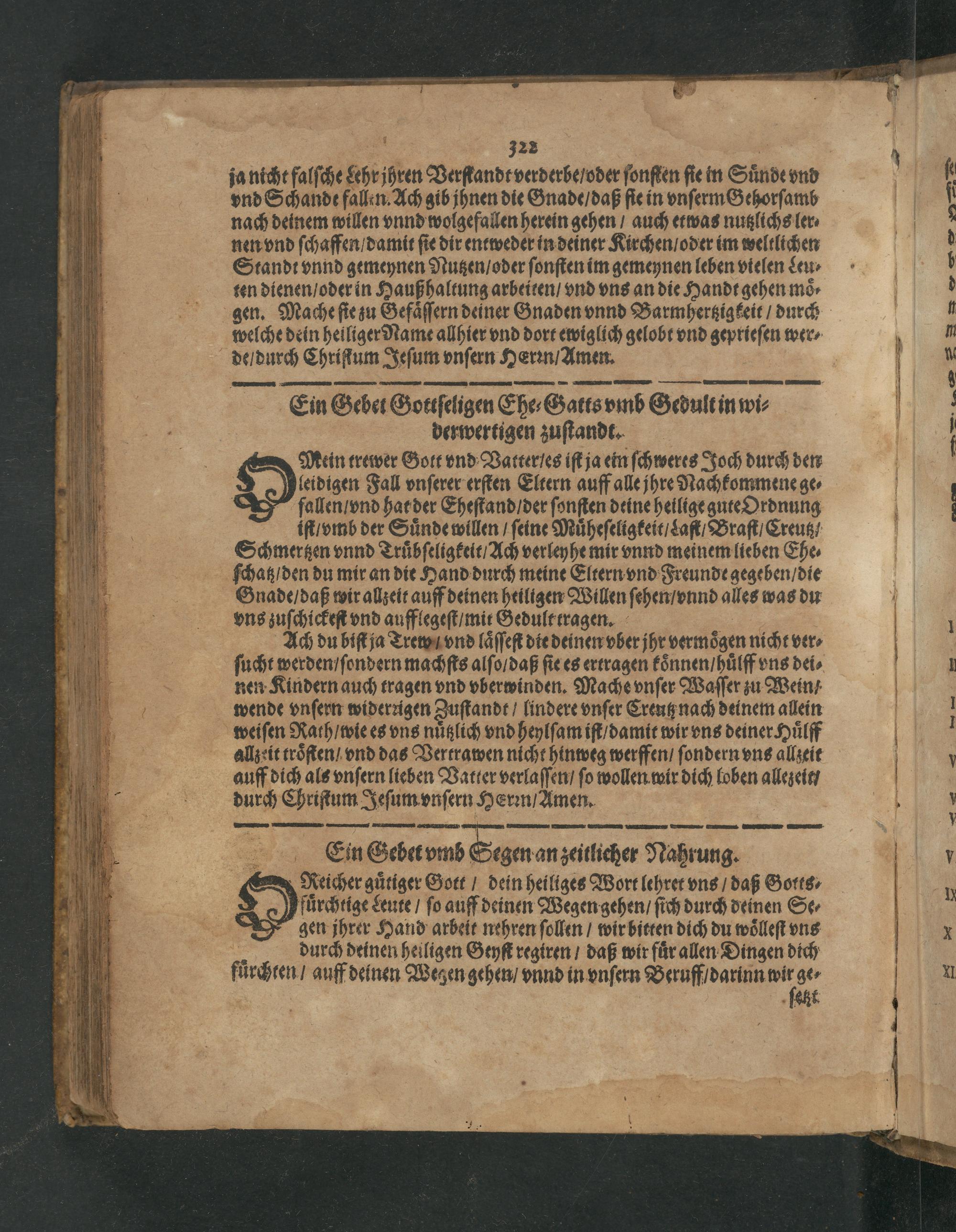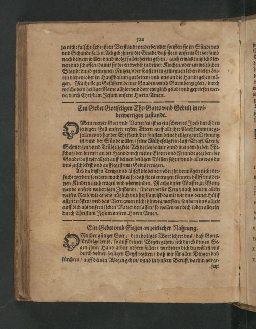 Ein Gebet vmb Segen an zeitlicher Nahrung. X Neicher guͤtiger Gott/ dein heiliges Wort lehret vns/ daß Gotts⸗ Nuͤrchtige Leute/ ſo auff deinen Wegen gehen/ ſich durch deinen Se⸗ A gen jhrer Hand arbeit nehren ſollen/ wir bitten dich du woͤlleſt vns . durch deinen heiligen Geyſt regiren/ daß wir fuͤr allen Dingen dich fuͤrchten/ auff deinen Wehen gehen/ vnnd in vnſern Beruff/ darinn 4 ge⸗ ſeht
