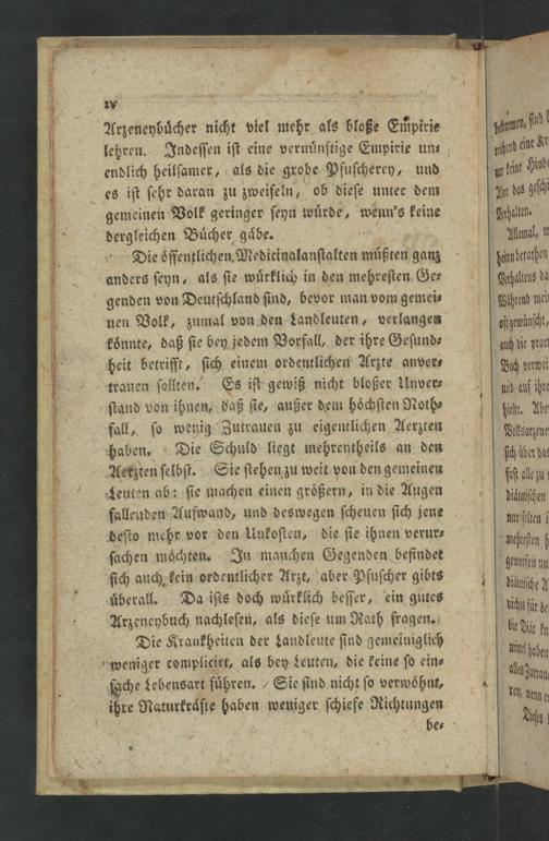 6 1V. Arzeneybuͤcher nicht viel mehr als bloße Eupirie lehren. Indeſſen iſt eine vernuͤnftige Empirie un⸗ endlich beilſamer, als die grobe Pfuſcherey, und es iſt ſehr daran zu zweifeln, ob dieſe unter dem b gemeinen Volk geringer ſeyn wuͤrde, wenn's keine dergleichen Buͤcher gaͤbe. Die oͤffentlichen Medicinalanſtalten nnaß ganz anders ſeyn, als ſie wuͤrklich in den mehreſten Ge⸗ genden von Deutſchland ſind, bevor man vom gemei⸗ nen Volk, zumal von den Landleuten, verlangen koͤnnte, daß ſie bey jedem Vorfall, der ihre Geſund⸗ heit betrifft, ſich einem ordentlichen Arzte anver⸗ trauen ſollten. Es iſt gewiß nicht bloßer Unver⸗ ſtand von ihnen, daß ſie, außer dem hoͤchſten? Nothe fall, ſo wenig Zutrauen zu eigentlichen Aerzten Plln, Die Schuld liegt mehrentheils an den Aerzten ſelbſt. Sie ſtehen zu weit von den gemeinen euten ab: ſie machen einen groͤßern, in die Augen fallenden Aufwand, und deswegen ſcheuen ſich jene deſto mehr vor den Unkoſten, die ſie ihnen verur⸗ ſachen moͤchten. In nnchen C. ſendan befindet ſich auch kein ordentlicher Arzt, aber Pfuſcher gibts 1 uͤberall. Da iſts doch wuͤrklich beſſer, ein gutes b Arzeneybuch nachleſen, als dieſe um Rath fragen. Die Krankheiten der Landleute ſind gemeiniglich weniger comwlicirt, als bey Leuten, die keine ſo ein⸗ ſoche Lebensart fuͤhren. Sie ſind nicht ſo verwoͤhnt, ihre Naturkraͤfte haben wennger ſchieſe Richtungen be⸗