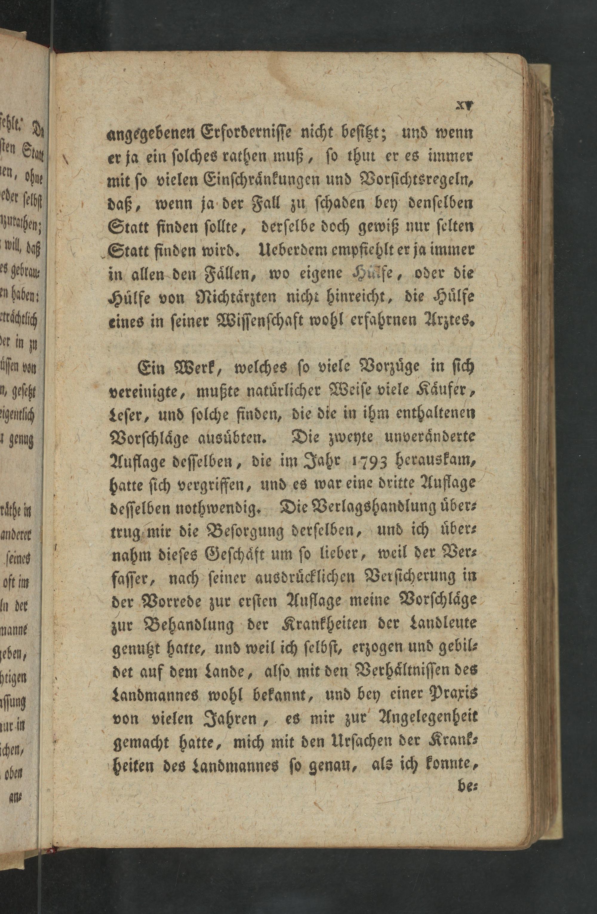 Ein Werk, welches ſo viele Vorzuͤge in ſich vereinigte, mußte natuͤrlicher Weiſe viele Kaͤufer, Leſer, und ſolche finden, die die in ihm enthaltenen Vorſchlaͤge ausuͤbten. Die zweyte unveraͤnderte Auflage deſſelben, die im Jahr 1793 berauskam, hatte ſich vergriffen, und es war eine dritte Auflage deſſelben nothwendig. Die Verlagshandlung uͤber⸗ trug mir die Beſorgung derſelben, und ich uͤber⸗ nahm dieſes Geſchaͤft um ſo lieber, weil der Ver⸗ faſſer, nach ſeiner ausdruͤcklichen Verſicherung in der Vorrede zur erſten Auflage meine Vorſchlaͤge zur Behandlung der Krankheiten der Landleute genutzt hatte, und weil ich ſelbſt, erzogen und gebil⸗ det auf dem Lande, alſo mit den Verhaͤltniſſen des Landmannes wohl bekannt, und bey einer Praxis von vielen Jahren, es mir zur Angelegenheit gemacht hatte, mich mit den Urſachen der Krank⸗ heiten des Landmannes ſo genau, als ich konnte,